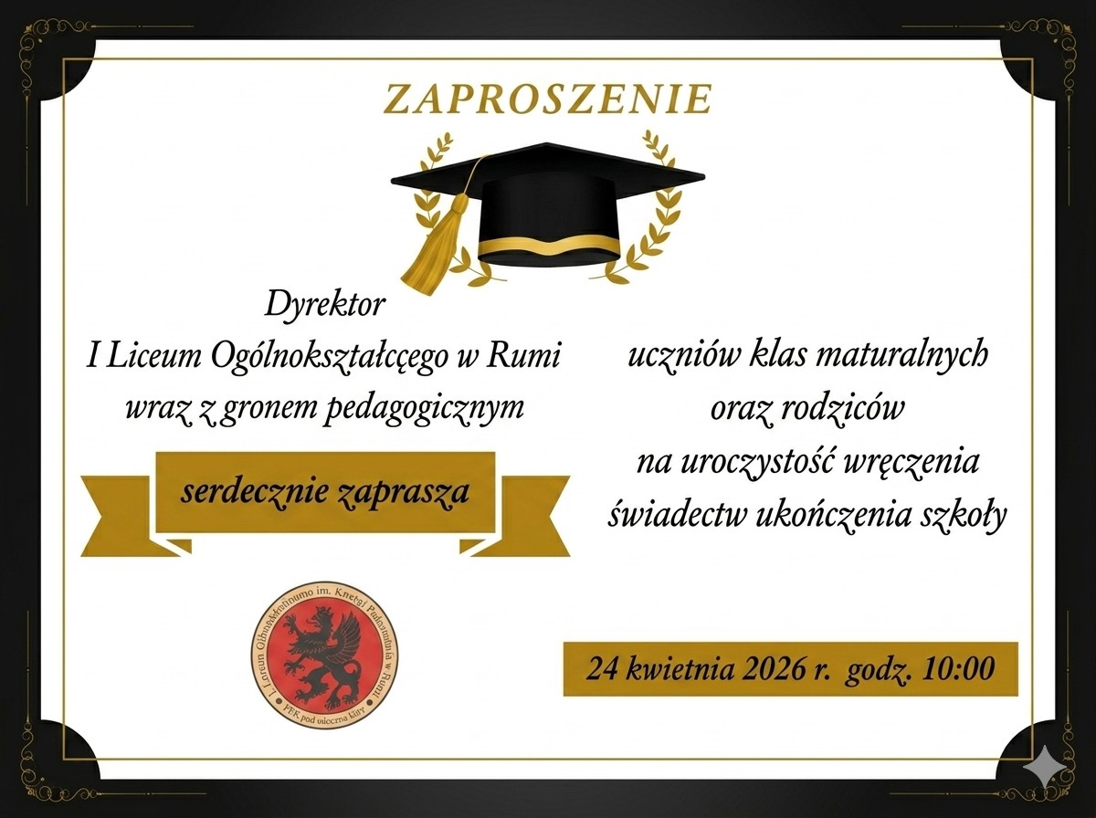 Zapraszamy na zakończenie roku szkolnego klas maturalnych na piątek 24 maja 2026r. na godzinę 10.00