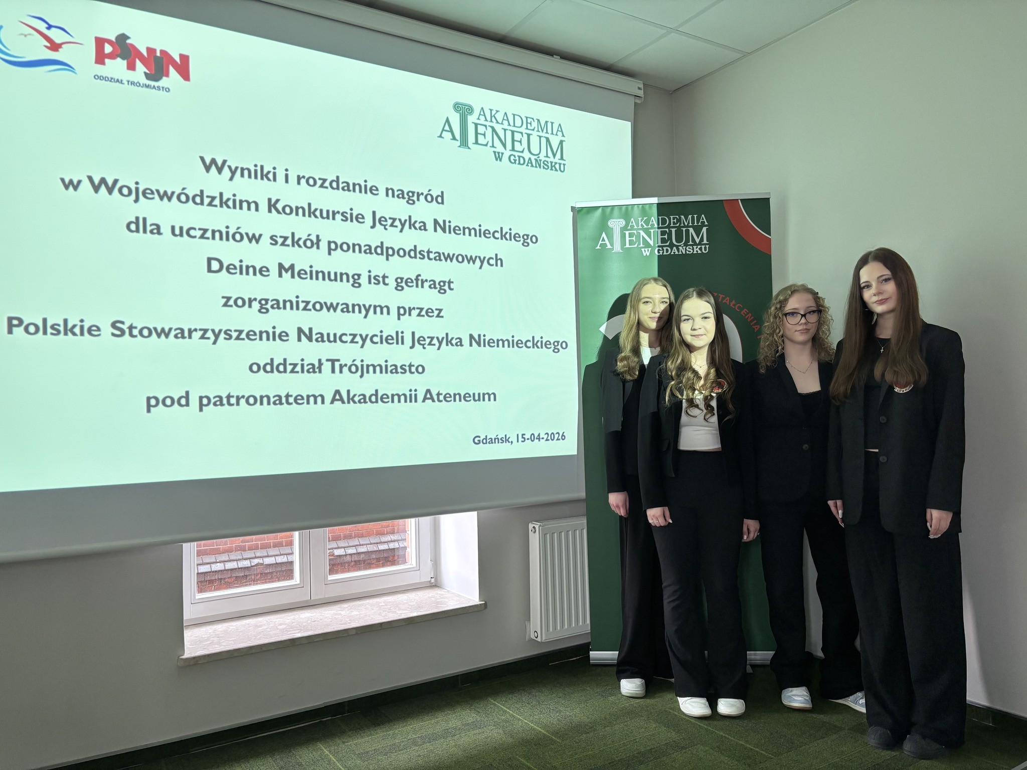 15 kwietnia w Akademii Ateneum odbył się finał trzeciej edycji wojewódzkiego konkursu „Deine Meinung ist gefragt”. Organizatorem konkursu było Polskie Stowarzyszenie Nauczycieli Języka Niemieckiego – oddział Trójmiasto. W tym roku patronat nad tym wydarzeniem objęła Akademia Ateneum, która była głównym fundatorem nagród oraz organizatorem gali wręczenia nagród. Oprawa wydarzenia była bardzo uroczysta – głos zabrali rektor uczelni prof. dr hab. lek. med. Waldemar Tłokiński oraz dr Katarzyna Kukowicz-Żarska, dziekan Wydziału Neofilologii, która wygłosiła krótki wykład na temat „Deine Meinung ist gefragt” („Twoja opinia się liczy”). Zadaniem zespołów było nagranie w języku niemieckim filmu, w którym uczniowie wypowiadali się na temat zdrowego stylu życia, ilustrując swoją wypowiedź przygotowaną prezentacją multimedialną. Z radością informujemy, że uczennice klasy III D Wiktoria Drożdż i klasy III G Zofia Czuchaj zajęły w konkursie III miejsce, a wyróżnienie otrzymały Laura Nietupska i Amelia Werbicka z klasy III C. Serdecznie gratulujemy naszym uczennicom. Ich zaangażowanie i kreatywność zostały docenione, a my życzymy im dalszych sukcesów.