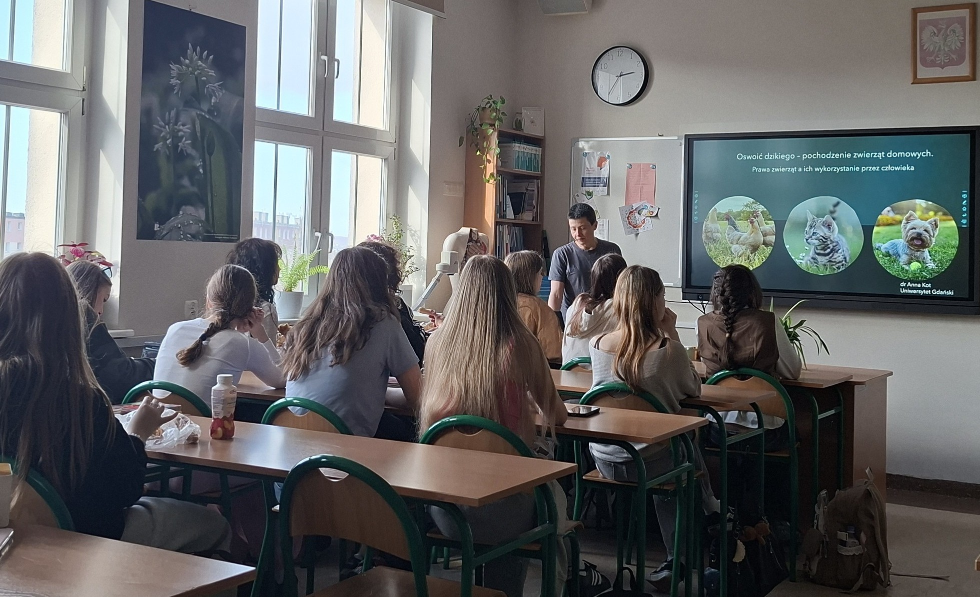 W piątek 27 marca uczniowie z grupy międzyoddziałowej rozszerzającej biologię (2ad) spotkali się z panią dr Anną Kot z Wydziału Biologii Uniwersytetu Gdańskiego. Było to spotkanie w ramach projektu edukacyjnego UG Poznaj pracę biologa. Tematem spotkania (wykładu i warsztatu) była historia udomowienia popularnych zwierząt gospodarskich. Młodzież poszerzyła wiadomości o źródła o pochodzeniu udomowionych zwierząt, rozróżnienie oswojenia a udomowienia, obserwację zmian cech morfologicznych, anatomicznych, fizjologicznych i psychologicznych u zwierząt domowych. Tematem warsztatów były prawa zwierząt w kontekście wykorzystania ich przez człowieka.
