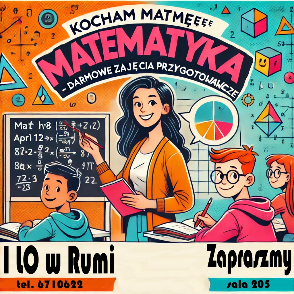 DROGI UCZNIU !!! Stresujesz się egzaminem ósmoklasisty? Chciałbyś się do niego dobrze przygotować? Chętnie Ci w tym pomożemy! Zapraszamy na darmowe cykliczne zajęcia: „Kocham matematykę” (dla uczniów klas 7 i 8) organizowane w Powiatowym Zespole Szkół nr 1 (LO im. Książąt Pomorskich) ul. Starowiejska 4 w Rumi. Zajęcia prowadzi nauczyciel matematyk wspólnie ze swoimi wychowankami z klasy o profilu politechniczno – matematyczno – fizycznym. Zajęcia będą odbywać się raz w miesiącu w soboty w godzinach 9.00 – 11.00 Osoby chętne proszone są o telefoniczne zgłaszanie się do sekretariatu szkoły: 58 671-06-22 oraz w czasie trwania nocy experymentów do sali 205 Harmonogram zajęć : 8.03.2025 12.04.2025 10.05.2025