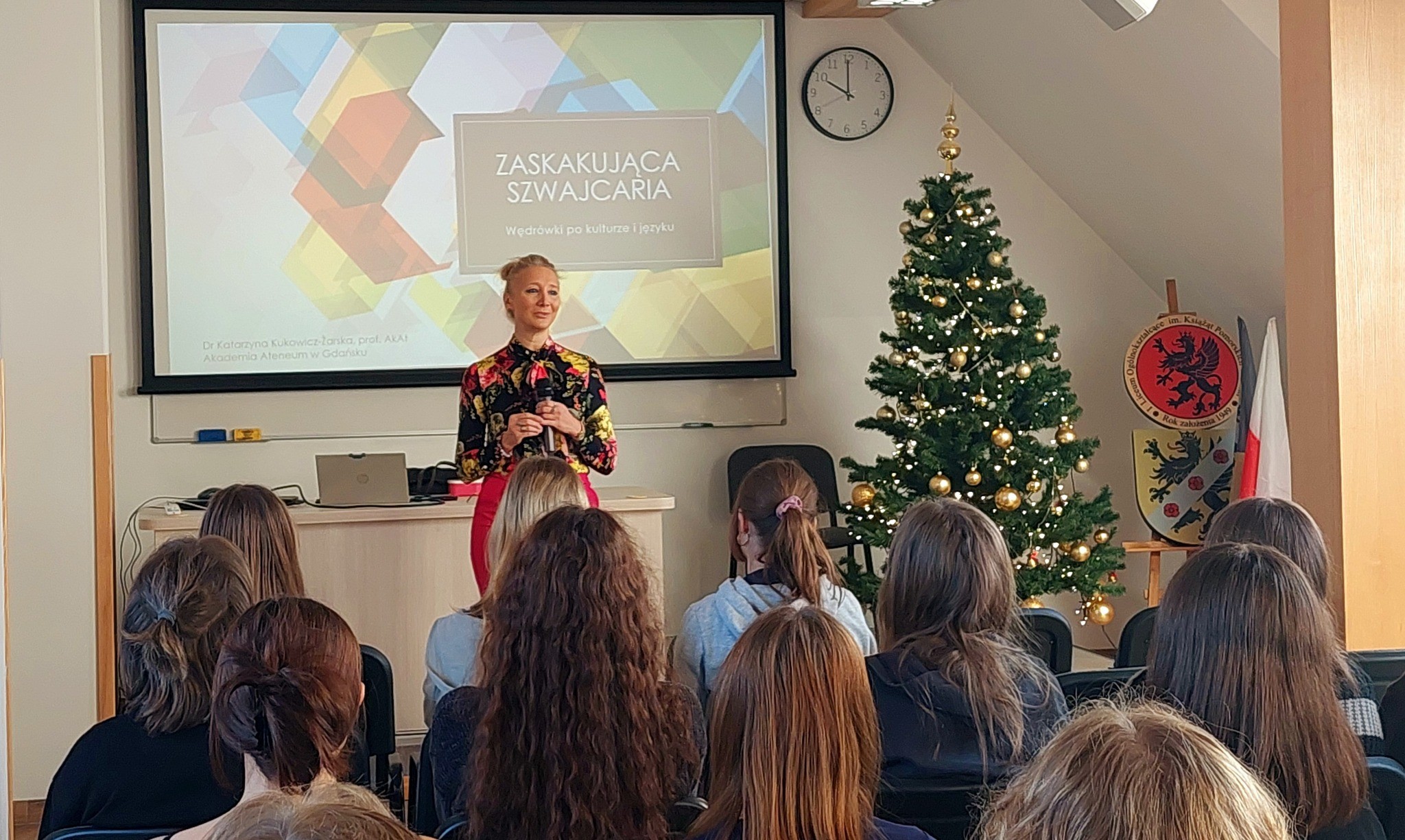 Dnia 11 grudnia 2024 roku gościliśmy w murach naszej szkoły panią dr Katarzynę Kukowicz-Żarską, dziekan Akademii Ateneum w Gdańsku. Pani dziekan poprowadziła warsztaty pt. „Zaskakująca Szwajcaria - wędrówki po kulturze i języku” dla uczniów klas dwujęzycznych: ID, IID i IIID. Podczas spotkania młodzież miała okazję zgłębić wiele interesujących faktów o Szwajcarii – kraju, który przyciąga nie tylko pięknymi krajobrazami, ale i wyjątkową kulturą. Warsztaty obfitowały w ciekawostki, z których niejedna była dla uczestników prawdziwym zaskoczeniem (np. fakt, że szwajcarskie prawo dopuszcza spożywanie mięsa z psów i kotów). Na zakończenie nie zabrakło również słodkiego akcentu – uczniowie zostali poczęstowani szwajcarskimi słodkościami, w tym słynną czekoladą Toblerone. Serdecznie dziękujemy pani dr Katarzynie Kukowicz-Żarskiej za przygotowanie i przeprowadzenie tak interesujących warsztatów, które odbyły się w ramach współpracy naszej szkoły z Akademią Ateneum w Gdańsku.