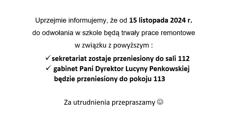 Uprzejmie informujemy, że od 15 listopada 2024 r. do odwołania w szkole będą trwały prace remontowe w związku z powyższym : sekretariat zostaje przeniesiony do sali 112 gabinet Pani Dyrektor Lucyny Penkowskiej będzie przeniesiony do pokoju 113