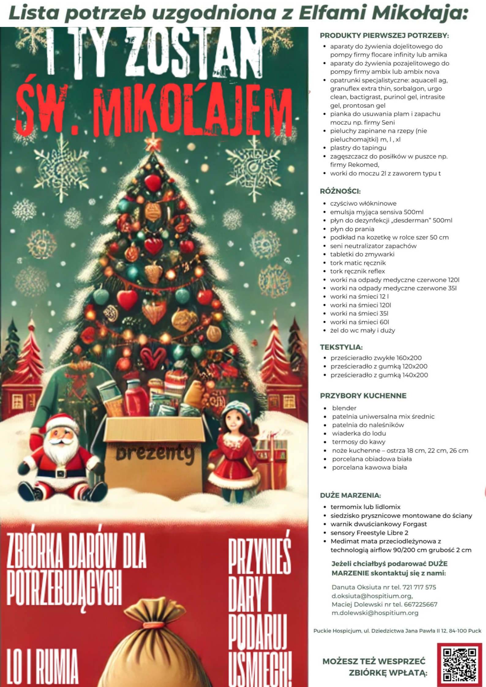 Drodzy Nauczyciele, Rodzice i Uczniowie, Razem już wiele zdziałaliśmy! Podczas Tygodnia Dbania o Relacje, dzięki Waszej hojności i przepysznym wypiekom, udało się zebrać 1000 zł na rzecz puckiego hospicjum. To dowód na to, jak ogromną moc ma nasza społeczność szkolna - dziękujemy z całego serca! ❤️ Ale czy możemy zrobić jeszcze więcej? Marzymy o tym, by podarować podopiecznym hospicjum radość mikołajkowych prezentów. Dlatego startujemy ze zbiórką darów rzeczowych! Ważne: rzeczy, które zbieramy, powinny pochodzić z listy w załączniku - to właśnie one są teraz najbardziej potrzebne. Dary można przynosić do pokoju nauczycielskiego lub do gab. CRO przy dyżurce szkolnej. Na zgromadzenie prezentów mamy czas do 16 grudnia. Wyobraźcie sobie - jeśli każdy z nas przyniesie choćby drobiazg z tej listy, razem stworzymy coś naprawdę wyjątkowego. Każda dar to nie tylko przedmiot, ale wyraz naszej troski, ciepła i wsparcia. Dołączcie do nas, przynieście coś od serca i podzielmy się dobrocią. Dziękujemy za każdą pomoc - razem możemy wszystko! Z serdecznymi pozdrowieniami, Koordynatorki Tygodnia Dbania o Relacje Ilona Karnicka, Agata Schulz @puckie_hospicjum #pomagamy #zbiórka #razem #lo1rumia