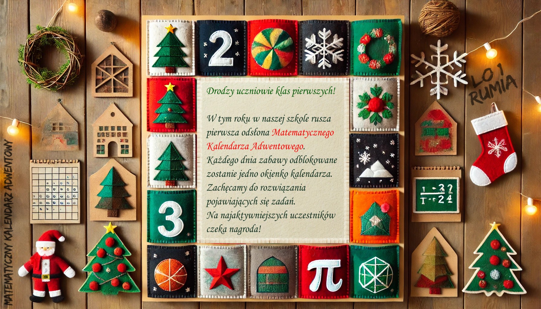 W tym roku w naszej szkole rusza pierwsza odsłona Matematycznego Kalendarza Adwentowego. Każdego dnia zabawy odblokowane zostanie jedno okienko kalendarza. Zachęcamy do rozwiązania pojawiających się zadań. Na najaktywniejszych uczestników czeka nagroda! Uczestnikiem zabawy może być każdy uczeń klasy pierwszej I LO w Rumi. Zabawa trwać będzie od 1 do 23 grudnia 2024 roku.