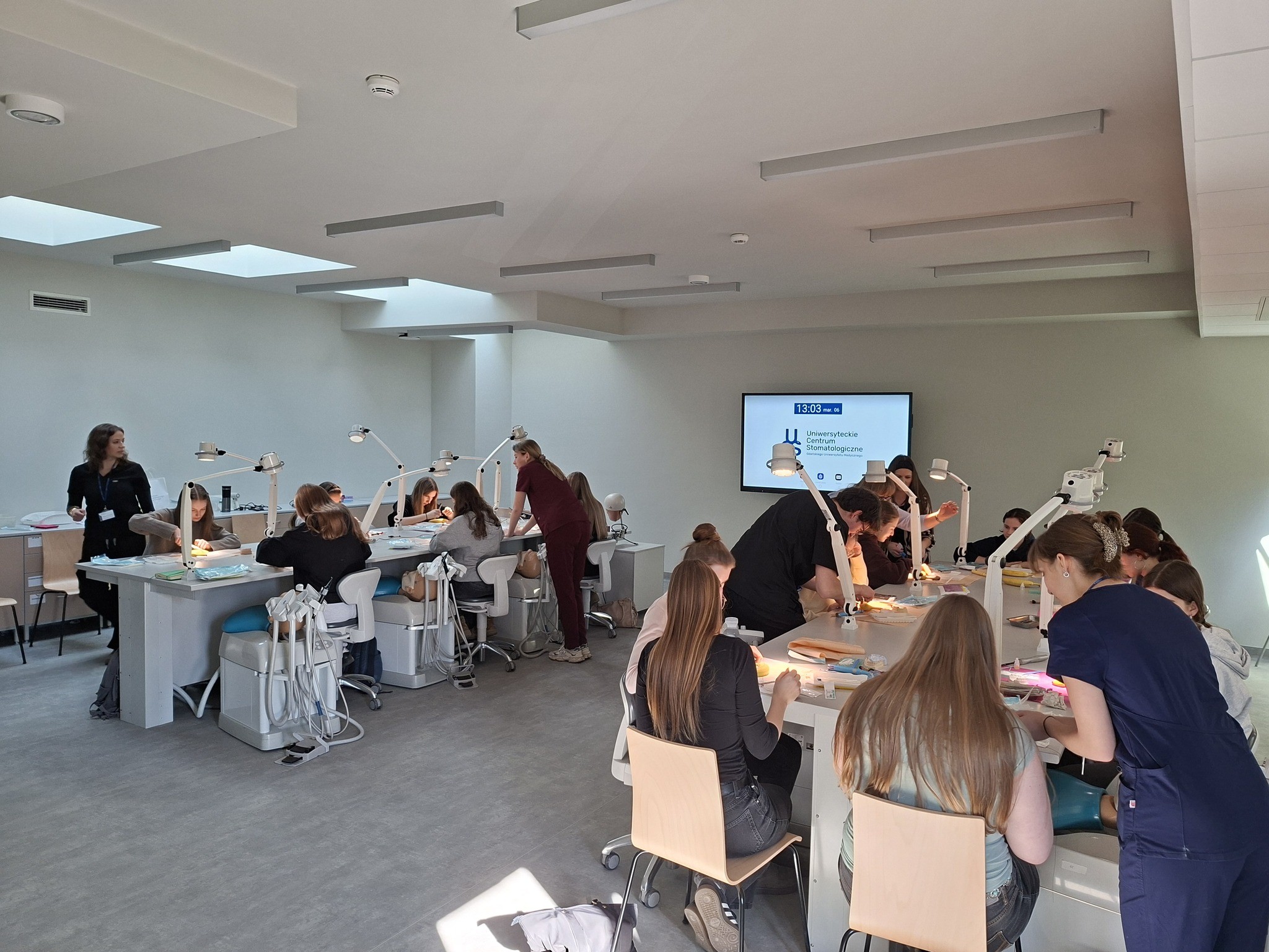 W piątek 6 marca, tuż po Dniu Dentysty, nasi uczniowie mieli wyjątkową okazję uczestniczyć w wykładach i warsztatach praktycznych w Uniwersyteckim Centrum Stomatologicznym Gdańskiego Uniwersytetu Medycznego. Wydarzenie odbyło się dzięki zaproszeniu pani dr n. med. Mirosławy Pellowskiej-Piontek. Zajęcia poprowadziły: pani dr n. med. Iwona Ordyniec Kwaśnica oraz pani lek. dent. Natalia Kempa. Podczas spotkania uczniowie poznali podstawy pracy stomatologa, a także mogli samodzielnie spróbować swoich sił w zadaniach praktycznych, takich jak wykonywanie szwów chirurgicznych czy tworzenie wypełnień stomatologicznych. W części warsztatowej aktywnie pomagali im również studenci stomatologii, wspierając uczestników w zdobywaniu pierwszych praktycznych umiejętności. Spotkanie było cenną okazją do poznania specyfiki studiów medycznych oraz pracy lekarza dentysty w nowoczesnym centrum klinicznym.
