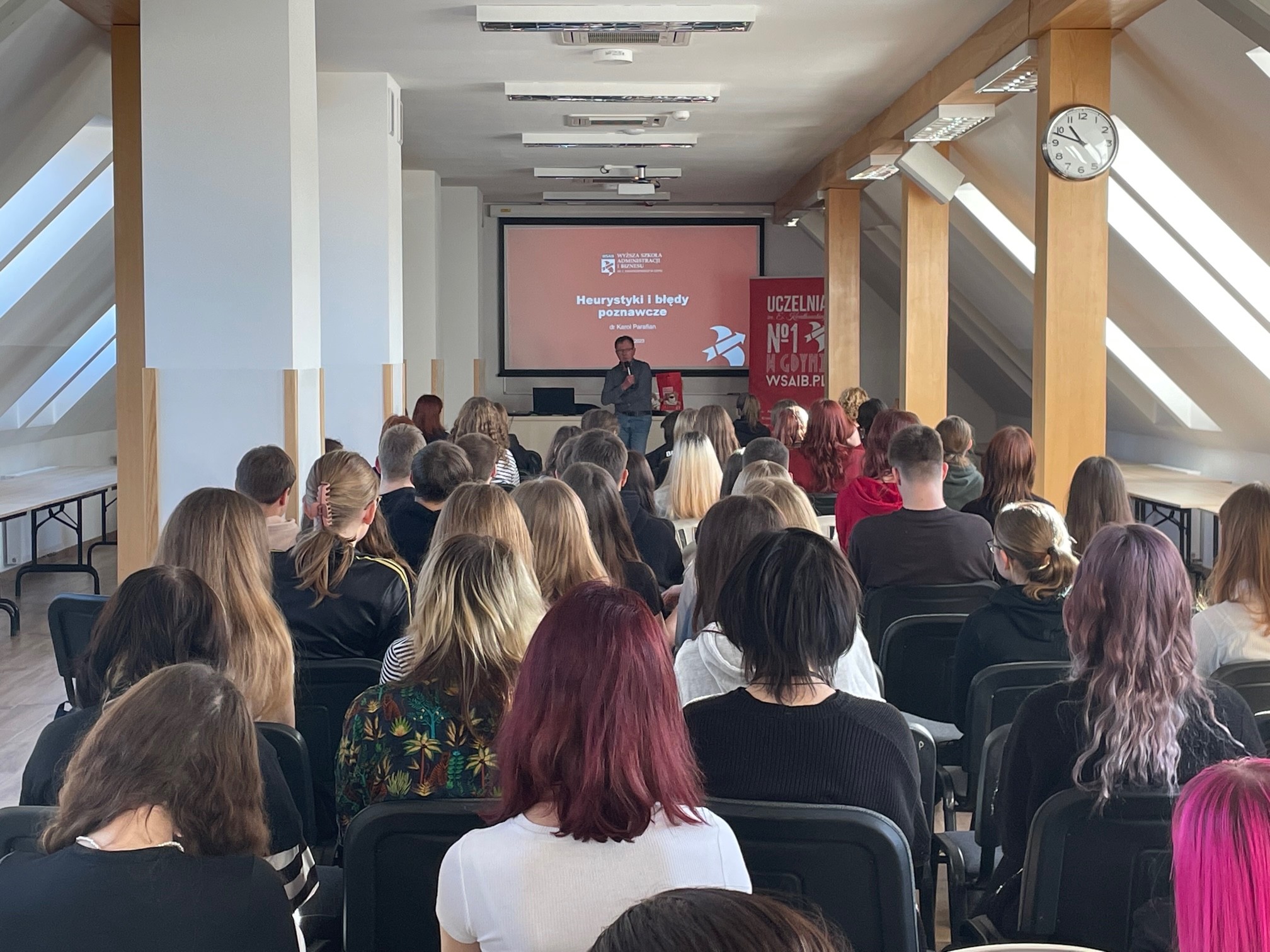 W poniedziałek 13 lutego klasy IF, IIF i IIG uczestniczyły w wykładzie pt. „Heurystyki i błędy poznawcze”, poprowadzonym przez dr Karola Parafiana, psychologa społecznego i psychoterapeutę, pracownika akademickiego z WSAiB w Gdyni. Spotkanie zostało przygotowane przez panią Monikę Ficek, kierowniczkę działu sprzedaży WSAiB. Pan doktor bardzo ciekawie opowiedział o tym, jakie są mechanizmy i skutki „myślenia na skróty”, czyli heurystyk, kiedy mogą one być przydatne, a kiedy prowadzą do błędnych wniosków, czyli tzw. błędów poznawczych.