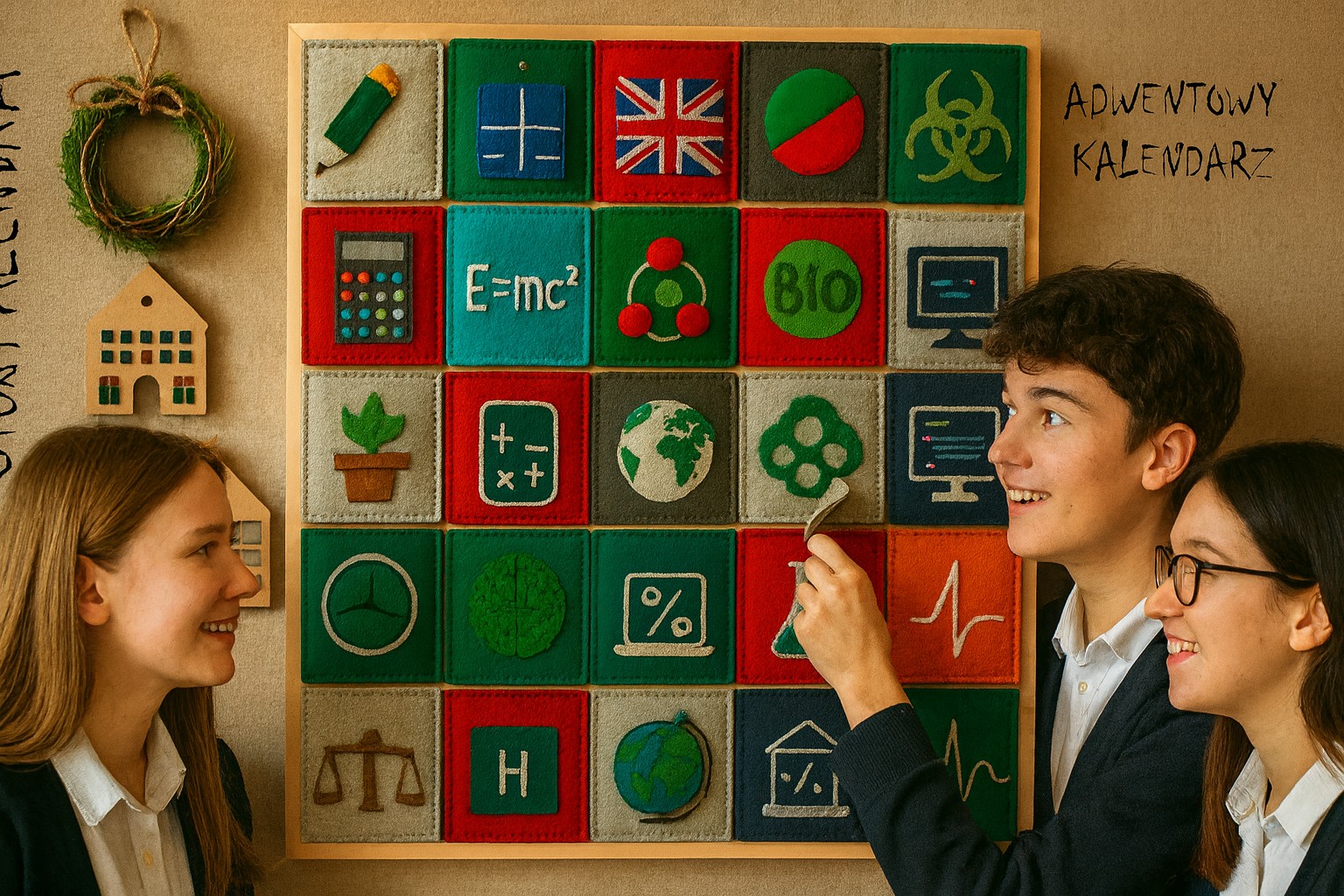 Czy czujecie już zapach pierników i dźwięk dzwoneczków? W naszej szkole grudzień będzie jeszcze bardziej wyjątkowy, bo rusza międzyprzedmiotowy Kalendarz Adwentowy pełen codziennych zadań, zagadek i świątecznych niespodzianek! Od 1 do 24 grudnia, punktualnie o północy, otwierać się będzie nowe okienko z zadaniem z innego przedmiotu. Każde wyzwanie będzie dostępne tylko przez jeden dzień - potem znika jak pierwsza gwiazdka na zimowym niebie, więc warto zaglądać regularnie. Za poprawne odpowiedzi odesłane na classroom kalendarza zdobywacie dodatkowe punkty z poszczególnych przedmiotów, a śmiałkowie, którzy uporają się z wszystkimi 24 zadaniami, mogą liczyć na nagrody-niespodzianki prosto z tajnego magazynu Mikołaja. Przygotujcie kubek gorącej czekolady, załóżcie świąteczne skarpety i dołączcie do zabawy. Niech grudzień będzie pełen radości, wyzwań i dobrej energii!
