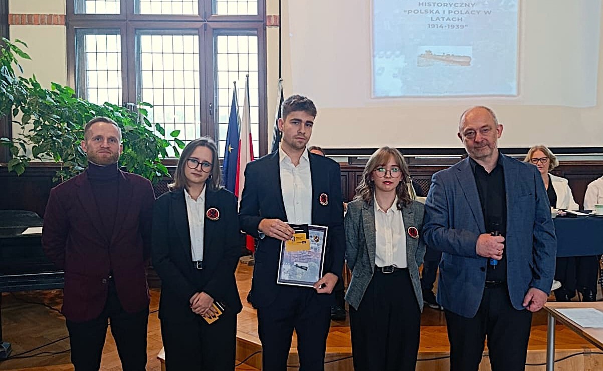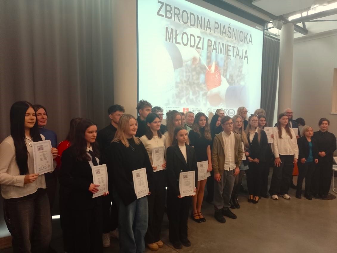 Dnia 28 listopada w Zespole Szkół Administracyjno-Ekonomicznych w Gdyni odbyła się Gala Finałowa VII edycji Wojewódzkiego Konkursu „Zbrodnia Piaśnicka – młodzi pamiętają”, której celem jest upamiętnienie ofiar Zbrodni Pomorskiej oraz kształtowanie pamięci historycznej wśród młodego pokolenia. W wydarzeniu wzięli udział uczniowie szkół z całego regionu, nauczyciele, zaproszeni goście oraz przedstawiciele Instytutu Pamięci Narodowej. Naszą szkołę godnie reprezentowała Aniela Pactwa z klasy II b, która swoją pracą plastyczną trafnie przekazała przesłanie na wyżej wymieniony temat. Z dumą ogłaszamy, że nasza uczennica w tym Konkursie zajęła II miejsce w kategorii plakat. W programie uroczystości znalazł się również niezwykle interesujący wykład dr. Bartosza Januszewskiego z IPN w Gdańsku, który przybliżył zebranym losy nauczycieli zamordowanych w ramach Zbrodni Pomorskiej. Gala Finałowa była nie tylko podsumowaniem konkursu, ale również ważną lekcją historii i patriotyzmu. Gratulujemy wszystkim nagrodzonym, a w szczególności uczennicy naszej szkoły! Grażyna Górak – opiekun merytoryczny uczennicy