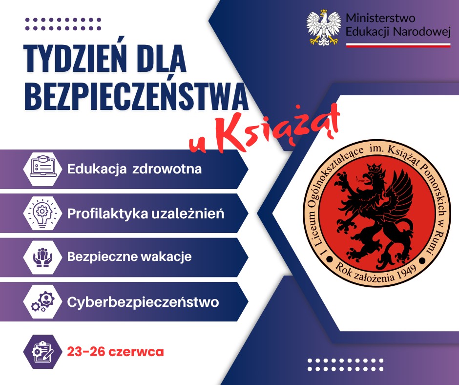 W ostatnim tygodniu nauki w I Liceum Ogólnokształcącym im. Książąt Pomorskich w Rumi młodzież będzie miała okazję zapoznać się z materiałami edukacyjnymi o zdrowiu, bezpieczeństwie oraz profilaktyce w ramach akcji informacyjno-edukacyjnej Tydzień dla Bezpieczeństwa przygotowanej przez Ministerstwo Edukacji Narodowej, Ministerstwo Spraw Wewnętrznych i Administracji, Ministerstwo Infrastruktury oraz Ministerstwo Cyfryzacji.