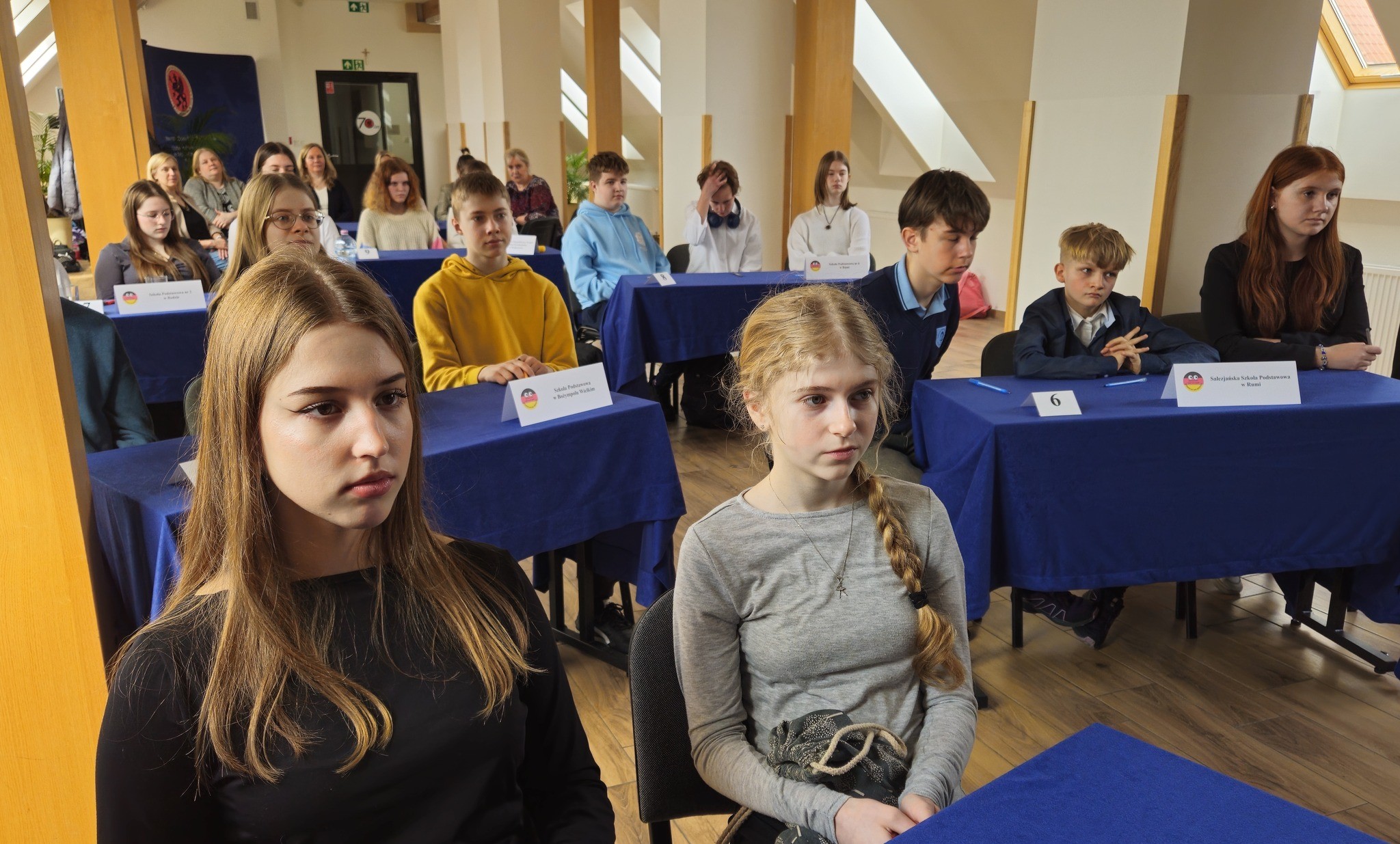 Konkurs "Deutsch mit Spiel und Spaß – czyli niemiecki na wesoło". W piątek 12 kwietnia na terenie naszej szkoły odbył się II i III etap konkursu "Deutsch mit Spiel und Spaß" dla szkół podstawowych z województwa pomorskiego. W pierwszym etapie przeprowadzonym w szkołach macierzystych udział wzięło 18 trzyosobowych zespołów, spośród których do drugiego etapu zakwalifikowało się 9 drużyn. Były to następujące szkoły: Szkoła Podstawowa z Bożegopola Wielkiego, Szkoła Podstawowa Nr 8 z Wejherowa. Społeczna Szkoła Podstawowa Nr 1 z Wejherowa (dwa zespoły), Szkoła Podstawowa Nr 6 z Rumi, Naja Szkoła/ Niepubliczny Zespół Szkolno-Przedszkolny z Rumi, Podstawowa Ekologiczna Szkoła Społeczna z Rumi, Salezjańska Szkoła Podstawowa z Rumi i Zespół Szkolno-Przedszkolny nr 2 z Redy. Uczestnicy konkursu rozwiązywali zadania sprawdzające ich umiejętności z zakresu leksyki, gramatyki, rozumienia tekstu słuchanego (piosenka) i czytania ze zrozumieniem oraz logicznego myślenia. Dzięki formie, jaką przyjął konkurs, rywalizacja przebiegała w nieformalnej atmosferze, która sprzyjała nauce i zabawie. Wśród zadań, z jakimi przyszło zmierzyć się uczniom, były między innymi krzyżówka, wykreślanka, zagadki oraz quizy z wykorzystaniem aplikacji internetowych. Dodatkową atrakcją był występ uczennic naszej szkoły, które zaprezentowały wiersze znanych niemieckich poetów. Po przerwie odbył się finał konkursu, w wyniku którego wyłoniono zwycięzców. Wyniki przedstawiały się w następujący sposób: I miejsce - Szkoła Podstawowa Nr 8 z Wejherowa II miejsce - Salezjańska Szkoła Podstawowa z Rumi III miejsce - Szkoła Podstawowa z Bożegopola Wielkiego IV miejsce - Naja Szkoła/Niepubliczny Zespół Szkolno-Przedszkolny z Rumi V miejsce - Społeczna Szkoła Podstawowa Nr 1 z Wejherowa Ponieważ nasz konkurs został wpisany na listę konkursów punktowanych w rekrutacji do szkół ponadpodstawowych na rok szkolny 2025/2026, uczestnicy, którzy zajęli pierwsze trzy miejsca, otrzymają w rekrutacji 2 punkty. Dziękujemy wszystkim uczestnikom za zaangażowanie i wspólną zabawę i zapraszamy do udziału w kolejnej edycji naszego konkursu za rok. Podziękowania kierujemy również do Starostwa Powiatowego w Wejherowie, Rady Rodziców i wydawnictwa Nowa Era za ufundowanie nagród i poczęstunku.