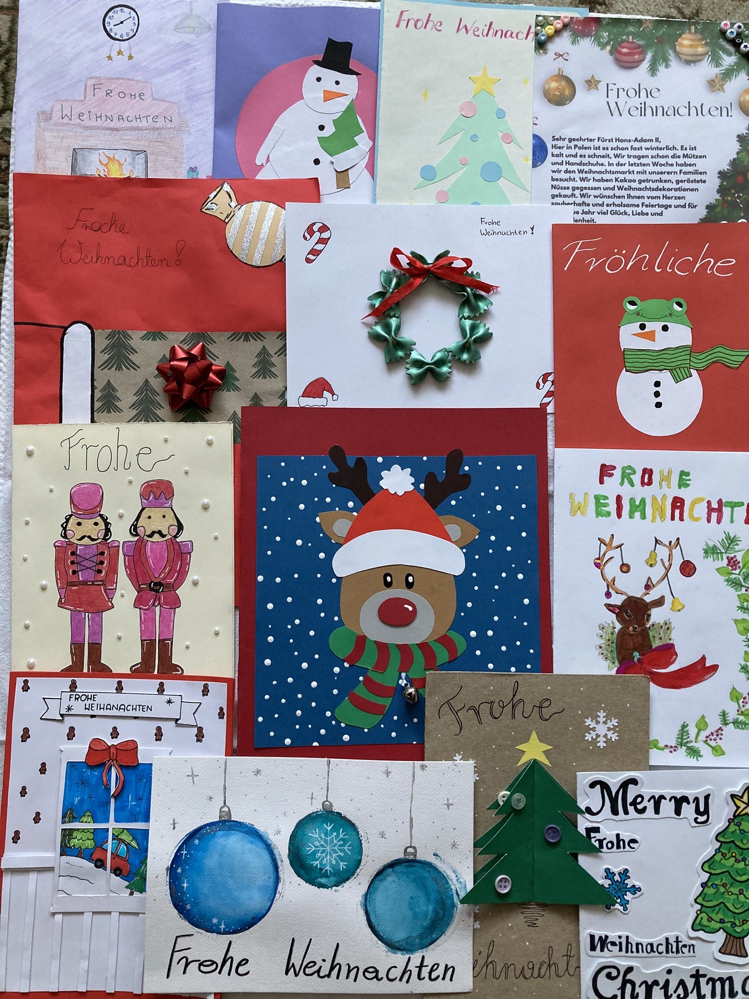 Od początku roku szkolnego grupa uczniów z klas 2 i 3 z zaangażowaniem uczestniczy w całorocznym konkursie znajomosci Niemiec z elementami języka niemieckiego. Uczniowie co miesiąc dostają jedno zadanie, np. wykonanie plakatu dotyczacego niemieckich zwyczajów kulinarnych czy nakręcenie filmiku - wywiadu ze znaną osobą. Zadaniem grudniowym było wykonanie kartki na Boże Narodzenie i napisanie życzeń świątecznych do Księcia Liechtensteinu. Wszystkie własnoręcznie, pieknie zrobione kartki zostały wysłane do zamku Vaduz. Miłą niespodzianką jest to, że ostatnio w odpowiedzi nasza szkoła otrzymała od Księcia Hansa Adama II życzenia noworoczne.