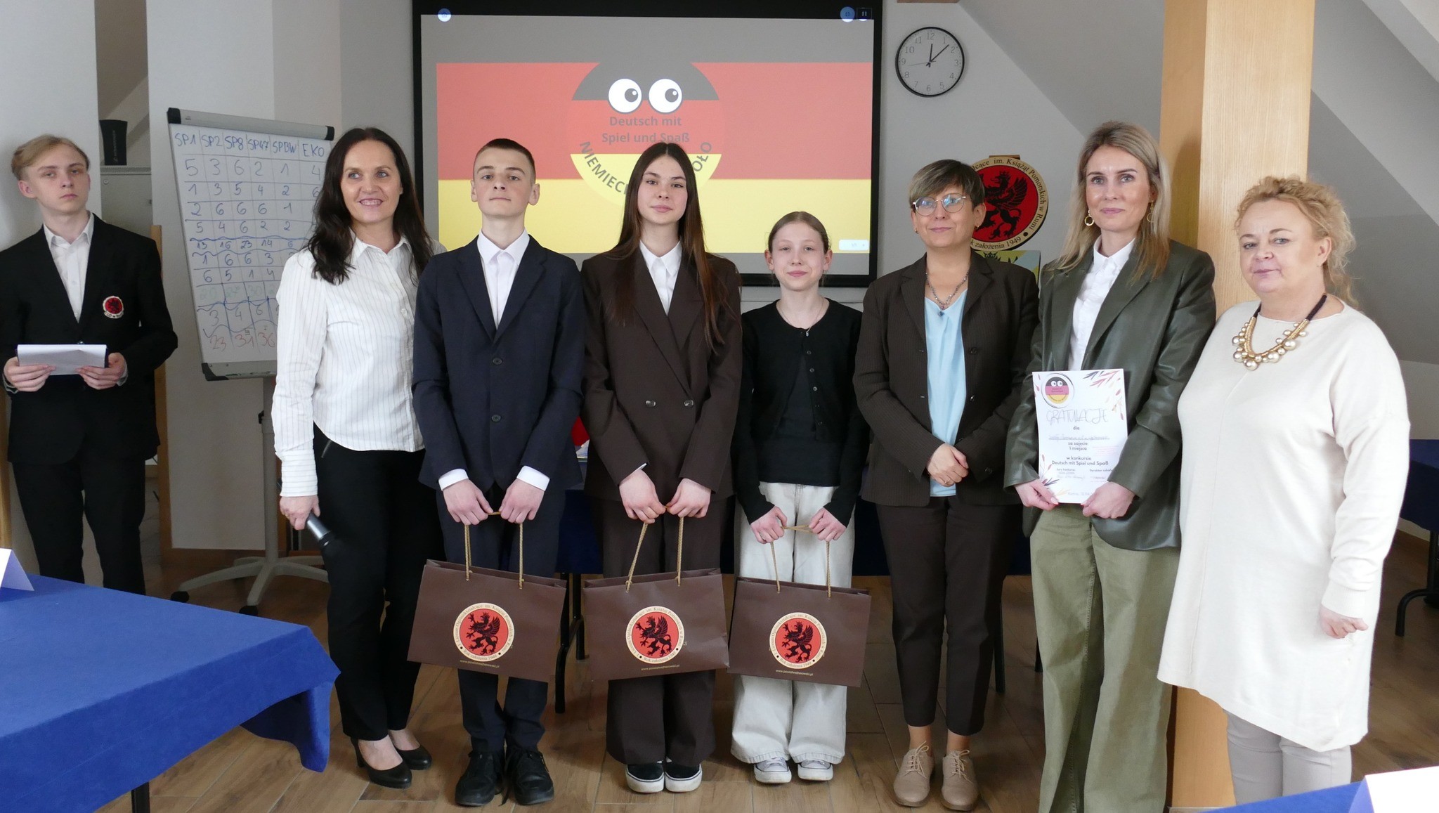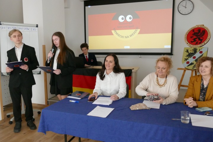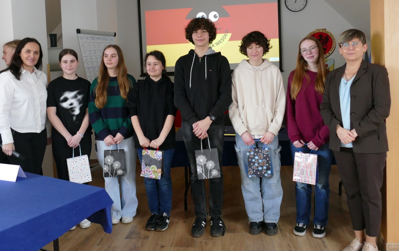 Dnia 12 kwietnia 2024 roku odbył się w naszej szkole konkurs języka niemieckiego „Deutsch mit Spiel und Spaß – niemiecki na wesoło”. Do udziału w konkursie zaprosiliśmy uczniów klas VII i VIII szkół podstawowych, którzy rywalizowali ze sobą w trzyosobowych zespołach.