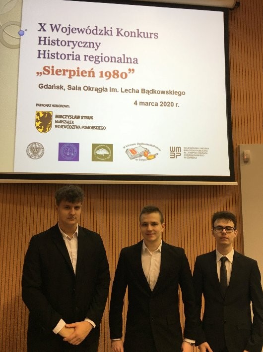 W dniu 6 grudnia 2019 roku w Powiatowym Zespole Szkół nr 4 w Wejherowie odbył się IX POWIATOWY KONKURS WIEDZY O OPOZYCJI ANTYKOMUNISTYCZNEJ W POLSCE W LATACH 1944-1989. W konkursie brało udział osiem drużyn ze szkół ponadgimnazjalnych naszego powiatu. Konkurs składał się z dwóch etapów – I etap to rozwiązanie testu z wiedzy zawierającego pytania otwarte i zamknięte, II etap przeprowadzony został z wykorzystaniem środków audiowizualnych. Naszą szkołę reprezentowali uczniowie: Marcin Juzala z klasy IIb oraz Piotr Konkol z klasy IIIb, którzy po zaciętej walce konkursowej zajęli II miejsce drużynowo. Marcin Juzala był najlepiej przygotowanym uczestnikiem konkursu i zajął indywidualnie I miejsce. Uczniów do konkursu przygotowała p. Grażyna Górak.