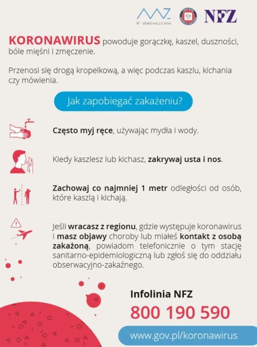 Więcej informacji o podstawowych środkach ochrony przeciwko rozwojowi epidemi koronawiursa znajduje się na stronie internetowej Ministerstwa Zdrowia.