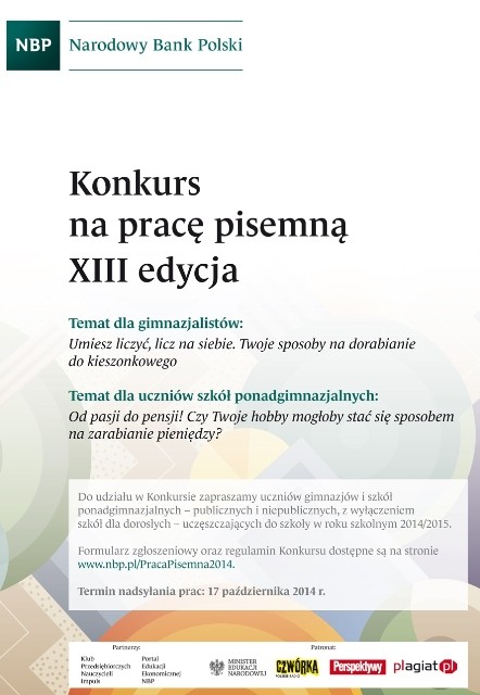 Narodowy Bank Polski zaprasza do udziału w kolejnej edycji Konkursu na pracę pisemną.Hasło konkursowe: Od pasji do pensji! Czy Twoje hobby mogłoby stać się sposobem na zarabianie pieniędzy?