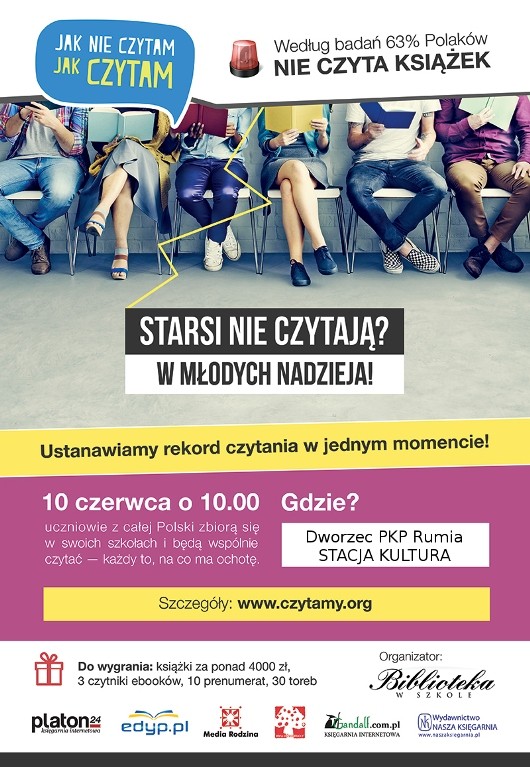 Uczestnicy akcji opanowali dworzec PKP Rumia i przystanki autobusowe ZKM, zachęcali do przyłączenia się i wspólnego czytania. Na dworcu spotkaliśmy się z grupą uczniów z Gimnazjum nr 4 w Rumi. Około godz. 10.00 rozpoczęło się publiczne czytanie książek, które było kontynuowane przez 10 minut. Następnie uczniowie ułożyli "wieżę" z książek przed wejściem do Stacji Kultura. Pani Dyrektor Biblioteki Miejskiej w Rumi zaprosiła uczestników do biblioteki miejskiej. Uczniowie skandując hasła propagujące czytelnictwo wrócili do szkoły. Inicjatorkami akcji była Ewa Domarus i Barbara Niewiedziała.
