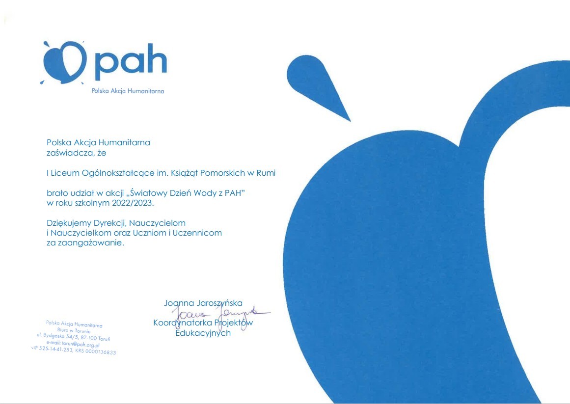 I Liceum Ogólnokształcące im. Książąt Pomorskich w Rumi brało udział w tegorocznej akcji Światowy Dzień Wody z PAH.