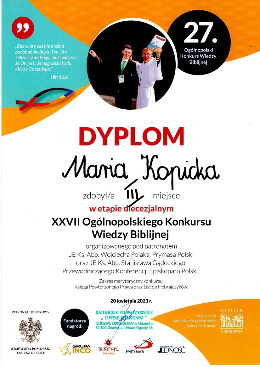 10 marca 2023 r.w II Liceum Ogólnokształcącym w Sopocie odbył się Międzyszkolny Konkurs Translatorski „Idiotyzm doskonałości-Wisława Szymborska-in translation”.Pierwsze miejsce zajęli w nim uczniowie naszej szkoły: Ewa Dziś z klasy IV b oraz Wojciech Włodarczyk z klasy IV e. Zadaniem uczestników konkursu było przetłumaczenie wiersza W.Szymborskiej -„Jacyś ludzie”. Przybyli goście mieli też okazję wysłuchać wykładu akademickiego na temat translatoryki. Wykład wygłosił prof.dr hab. David Malcolm -literaturoznawca i tłumacz.