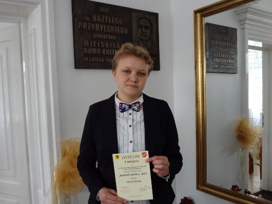 W dniu 9 maja 2019 roku, uczennica nasze szkoły - Maria Roda z klasy IIe , brała udział XLVIII Miejskim Konkursie Recytatorskim Prozy i Poezji Kaszubskiej „Rodnô Mòwa". Do konkursu Maria musiała przygotować dwa utwory: wiersz i prozę. Nasza uczennica wybrała wiersz Leona Heyke „Pòmòrsczi Grif”, oraz obszerny fragment utworu „Gôdczi wùje Léòna” Jerzego Hoppe, byłego Dyrektora naszego liceum. W konkursie tym Marysia zajęła I miejsce i tym samym, zakwalifikowała się do kolejnego etapu konkursu