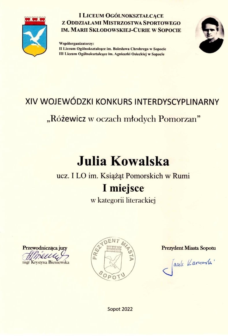 Uczennica klasy I g- Julia Kowalska zajęła I miejsce w XIV edycji Wojewódzkiego Konkursu Interdyscyplinarnego "Różewicz w oczach młodych Pomorzan.