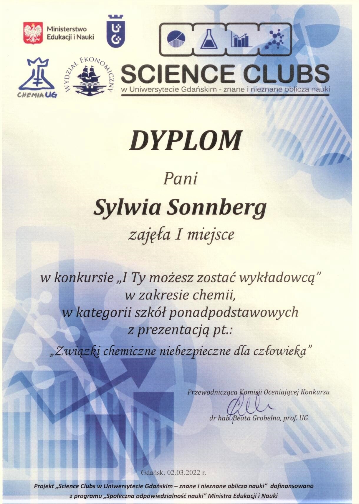 Uczennica klasy 3cg Sylwia Sonnberg została laureatką konkursu „I Ty możesz zostać wykładowcą” realizowanego w ramach projektu MEiN „Science Clubs w Uniwersytecie Gdańskim – Znane i nieznane oblicza nauki”.