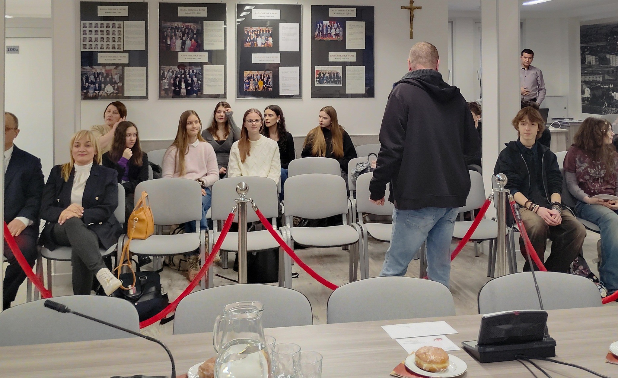 Przed obradami uczniowie mieli spotkanie z Panem Leszkiem Kiersznikiewiczem - wiceprzewodniczącym Rady Miejskiej, który wprowadził młodzież w tematykę obrad i sposób w jaki odbywa się głosowanie radnych.