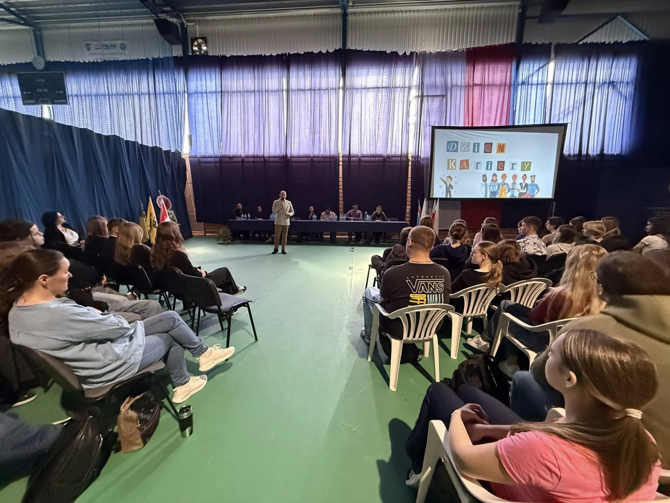 Wśród zaproszonych gości, na których składali się nasi przyjaciele, członkowie rodzin naszych uczniów czy absolwenci, znaleźli się przedstawiciele wielu zawodów takich jak policjant, aktor, dziennikarz, marynarz, dietetyk, architekt, pracownik agencji reklamowej czy właścicielka biura rachunkowego. Uczniowie klas trzecich, zgromadzeni na sali gimnastycznej, usłyszeli różnorodne historie związane z pracą jak również ścieżką kariery, niekiedy krętą lub wyboistą, ale za każdym razem fascynującą.