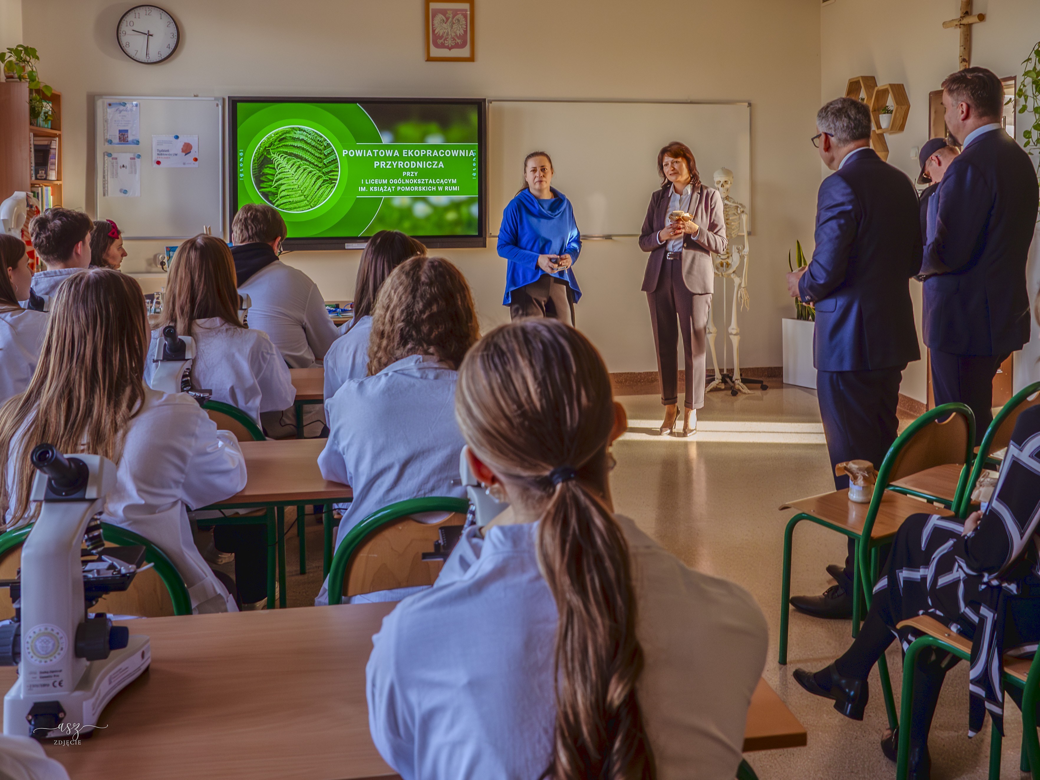 Z okazji otwarcia Powiatowej EkoPracowni Przyrodniczej w I Liceum Ogólnokształcącym im. Książąt Pomorskich w Rumi, 13 października zorganizowano uroczystość, która zgromadziła Dyrekcję Szkoły, nauczycieli, uczniów oraz zaproszonych gości. Gościliśmy prezesa Wojewódzkiego Funduszu Ochrony Środowiska i Gospodarki Wodnej w Gdańsku pana Szymona Gajdę, wicestarostę powiatu wejherowskiego pana Jacka Thiel oraz przewodniczącą Rady Rodziców panią Patrycję Biegańską.