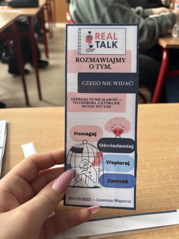 Uczniowie naszej szkoły: Hanna Tobolska, Paulina Derc, Maksymilian Kłosin, Natasza Hetmańczyk, Nina Zajdler oraz Natalia Karkowska realizują projekt „Realtalk” w ramach olimpiady Zwolnieni z Teorii. Celem inicjatywy jest zwiększanie świadomości na temat zdrowia psychicznego, ze szczególnym uwzględnieniem problemu depresji wśród młodzieży.