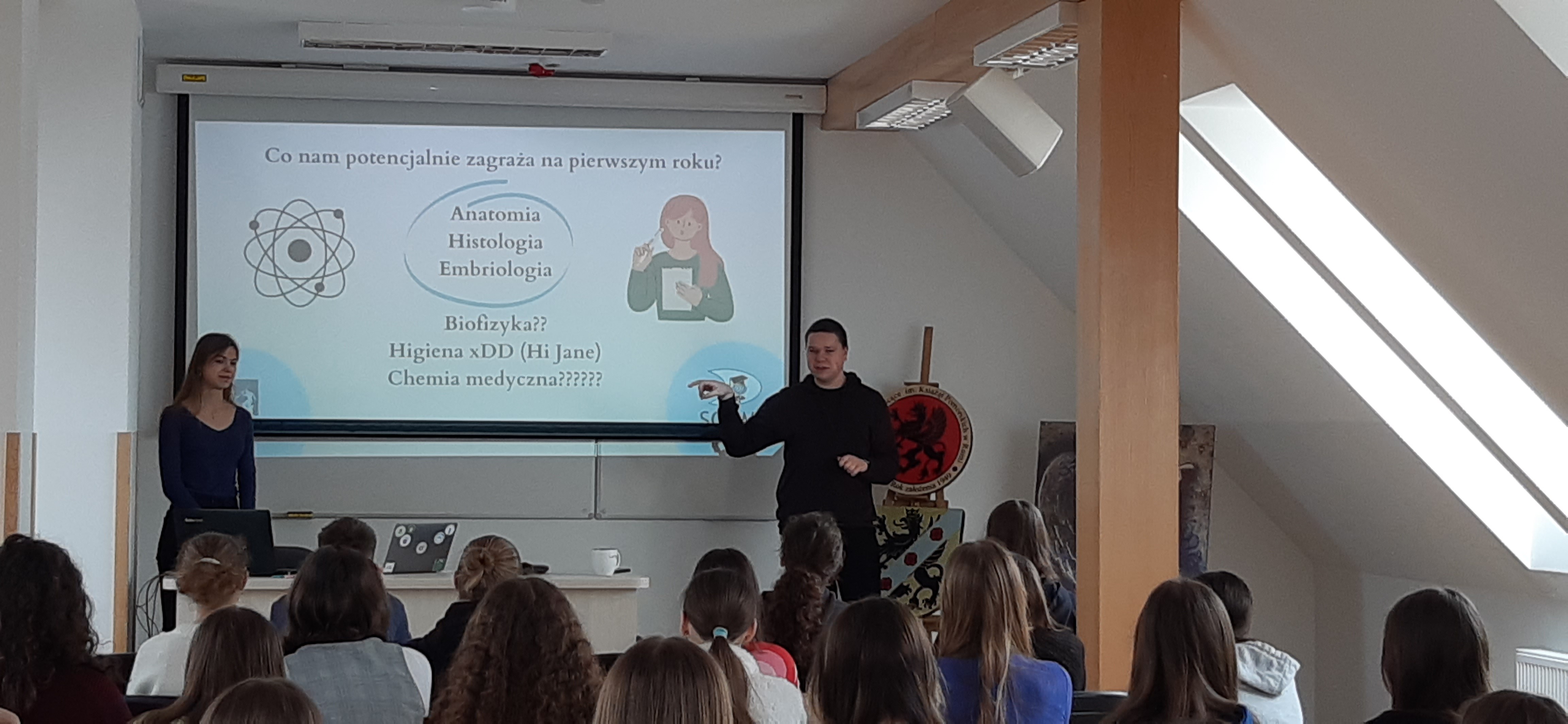 Pani Aleksandra Bobrowska i pan Piotr Sobisz spotkali się z uczniami klas pierwszych, trzecich i czwartych w których jednym z przedmiotów wiodących jest biologia. W trakcie spotkania opowiedzieli o codziennym życiu na uczelni, o przedmiotach, wykładach, kolokwiach, egzaminach oraz o organizacji czasu. Uczniowie mieli okazję zadać pytania o najbardziej interesujące ich tematy. Przybliżono także kwestię rekrutacji na medycynę na różne uczelnie wyższe w Polsce.