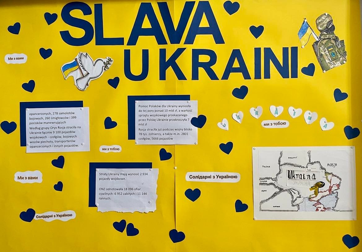 24 lutego 2023 mija rocznica drugiego, tym razem jawnego i jeszcze brutalniejszego ataku Rosji na Ukrainę. Społeczność naszej szkoły w symboliczny sposób pragnie oddać hołd ofiarom tej wojny oraz zamanifestować naszą solidarność z narodem ukraińskim.