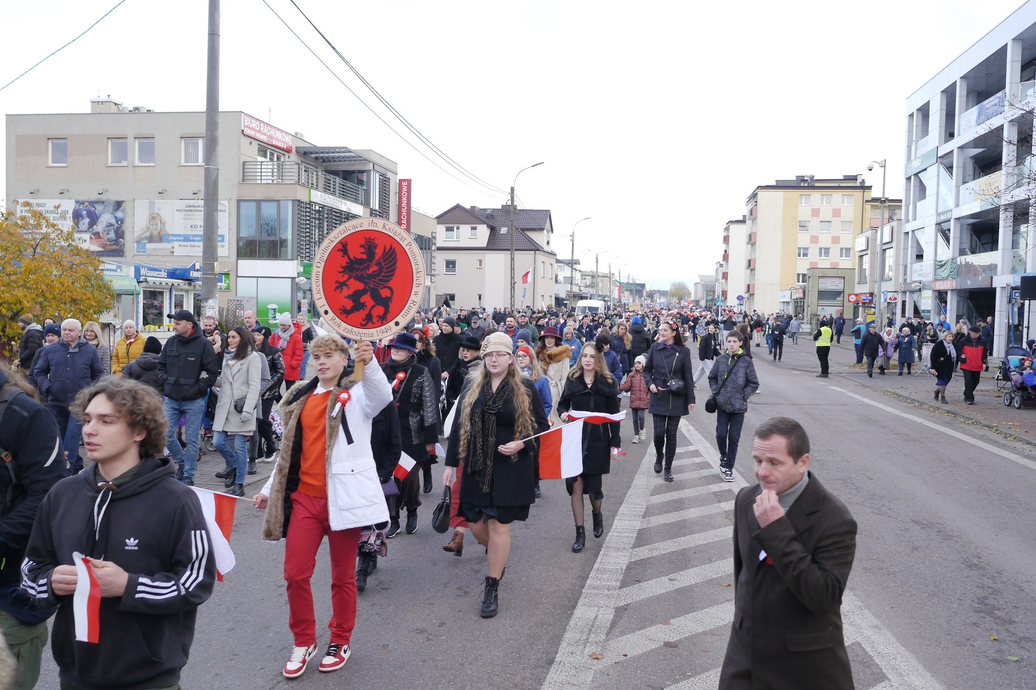 Nazajutrz nasza szkoła włączyła się w powiatowe i miejskie uroczystości związane z rocznicą. Po mszy świętej, najpierw w Wejherowie, potem w Rumi, niektórzy w strojach z epoki, w podniosłym nastroju i atmosferze radości, z biało- czerwonymi flagami, przeszli w Paradzie Niepodległości ulicami miast.