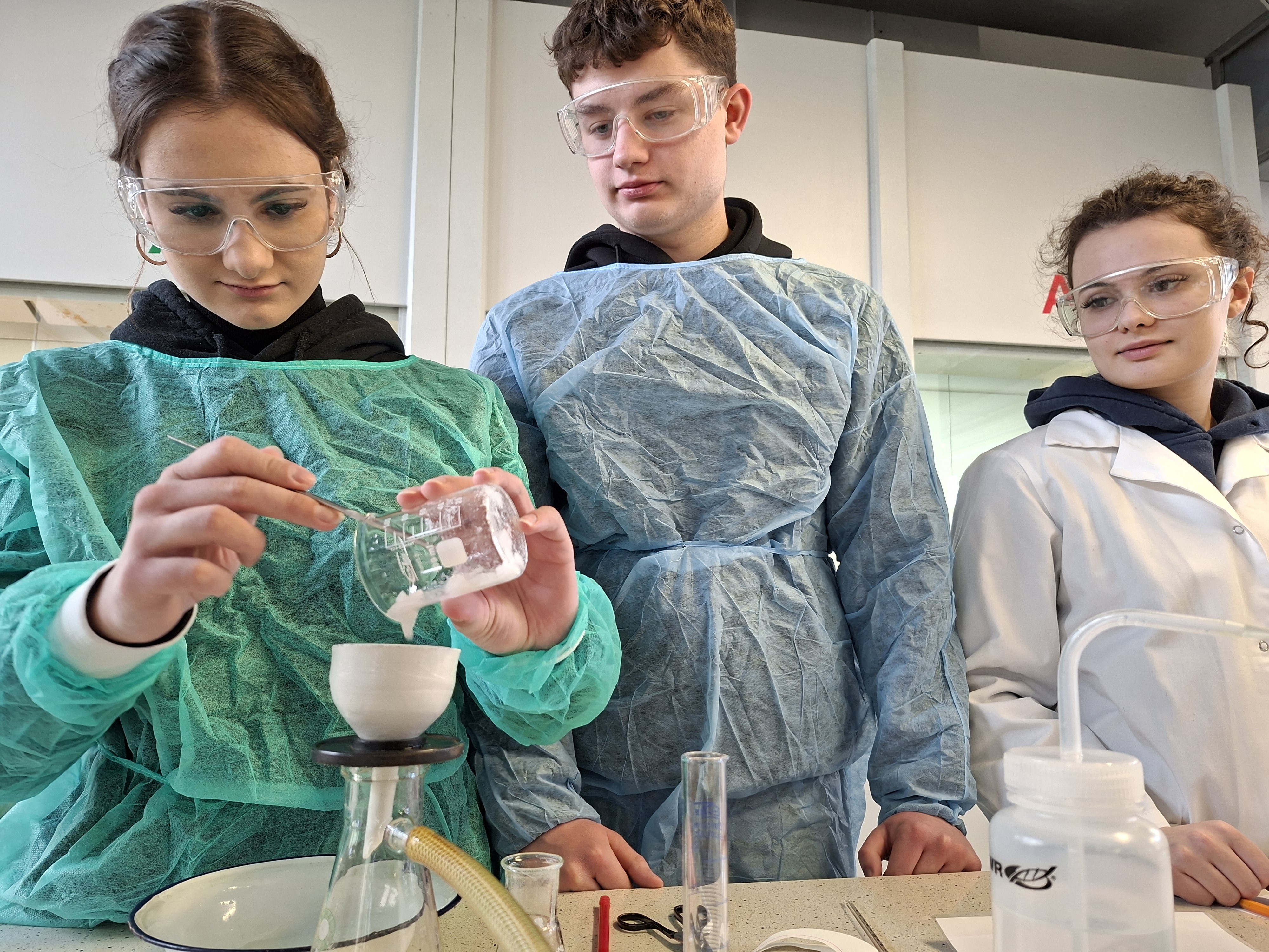 Synteza aspiryny? Dlaczego nie! Uczniowie klasy 4C (profil z rozszerzoną biologią i chemią) w środę 4 lutego uczestniczyli w przygotowanych dla nich warsztatach laboratoryjnych na Katedrze i Zakładzie Chemii Organicznej Wydziału Farmaceutycznego GUMed. Mogliśmy poczuć się przez chwilę jak Felix Hoffmann.