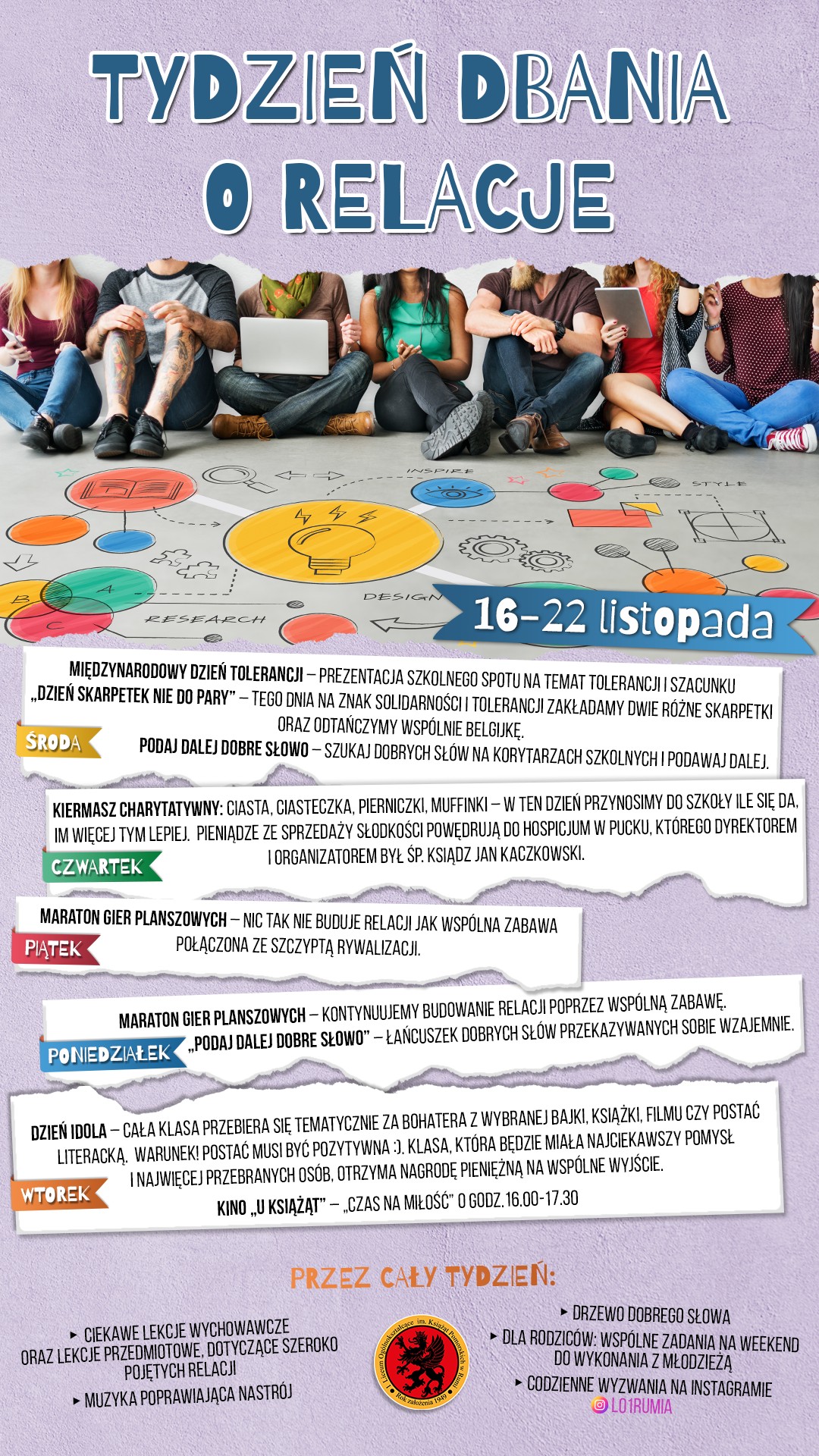 Od najbliższej środy rusza TYDZIEŃ DBANIA O RELACJE 🤝. To już druga edycja projektu powstałego ze współpracy z Fundacja Dbam o Mój Zasięg - Szkoła Odpowiedzialna Cyfrowo. W ramach tego tygodnia wspólnie z Samorządem Uczniowskim zaplanowaliśmy dla Uczniów, Rodziców i Nauczycieli wspólne aktywności. Będzie się działo! Śledźcie nas na szkolnym Facebooku i Insagramie oraz zaglądajcie do dziennika elektronicznego Librus.