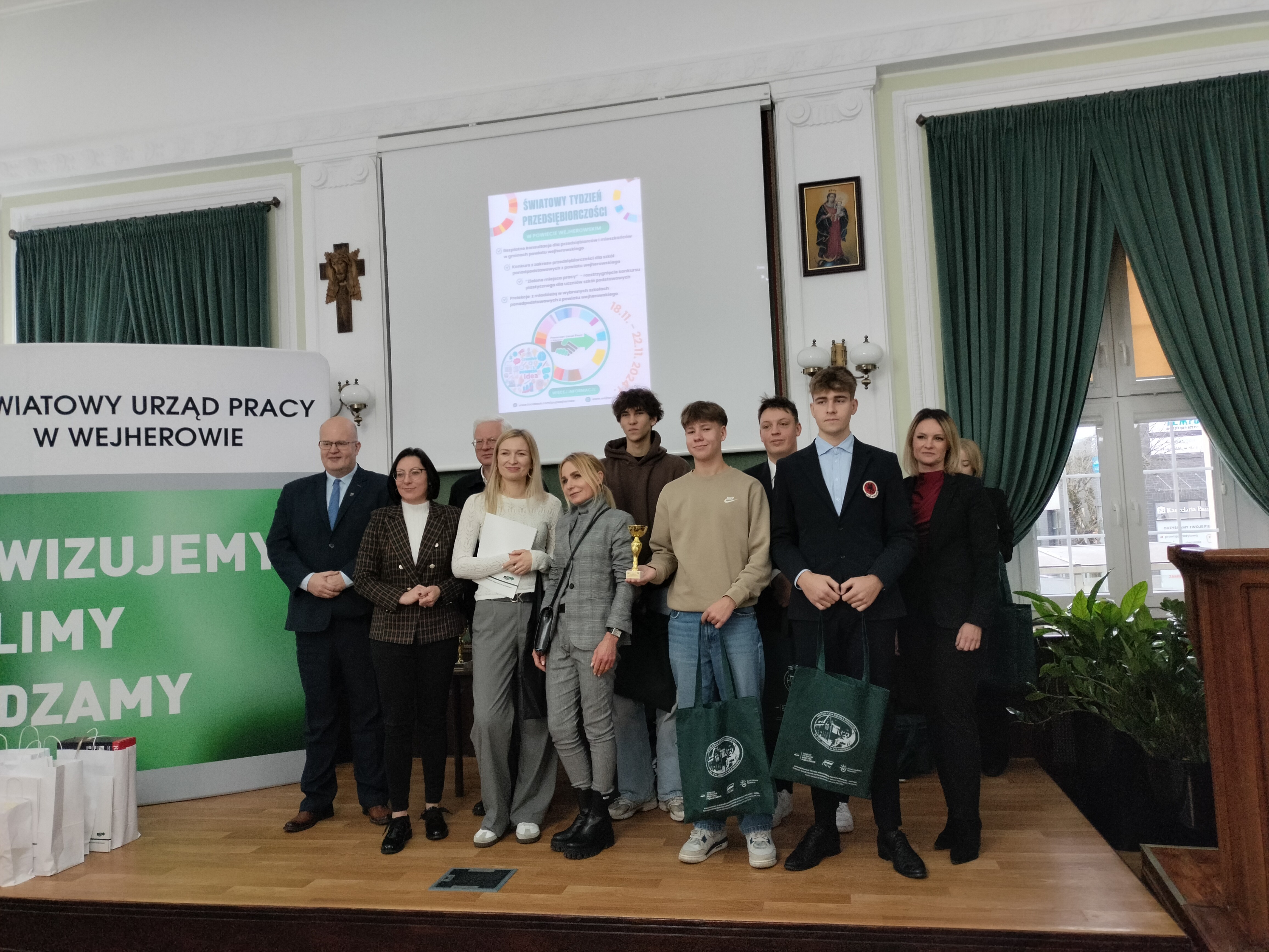 W ramach światowego Tygodnia Przedsiębiorczości uczniowie klasy 3a wzięli udział w turnieju pt. " Lider Przedsiębiorczości" organizowanego przed Powiatowy Urząd Pracy w Wejherowie. W konkurencji brało udział 10 szkół z powiatu Wejherowskiego. Uczestnicy rozwiązywali zadania przygotowane na kanwie znanych teleturniejów. Tematyka dotyczyła szeroko pojętej przedsiębiorczości. Pomimo, że nie zajeliśmy pierwszego miejsca wróciliśmy z turnieju zwycięsko z pucharem. Serdecznie gratulujemy!