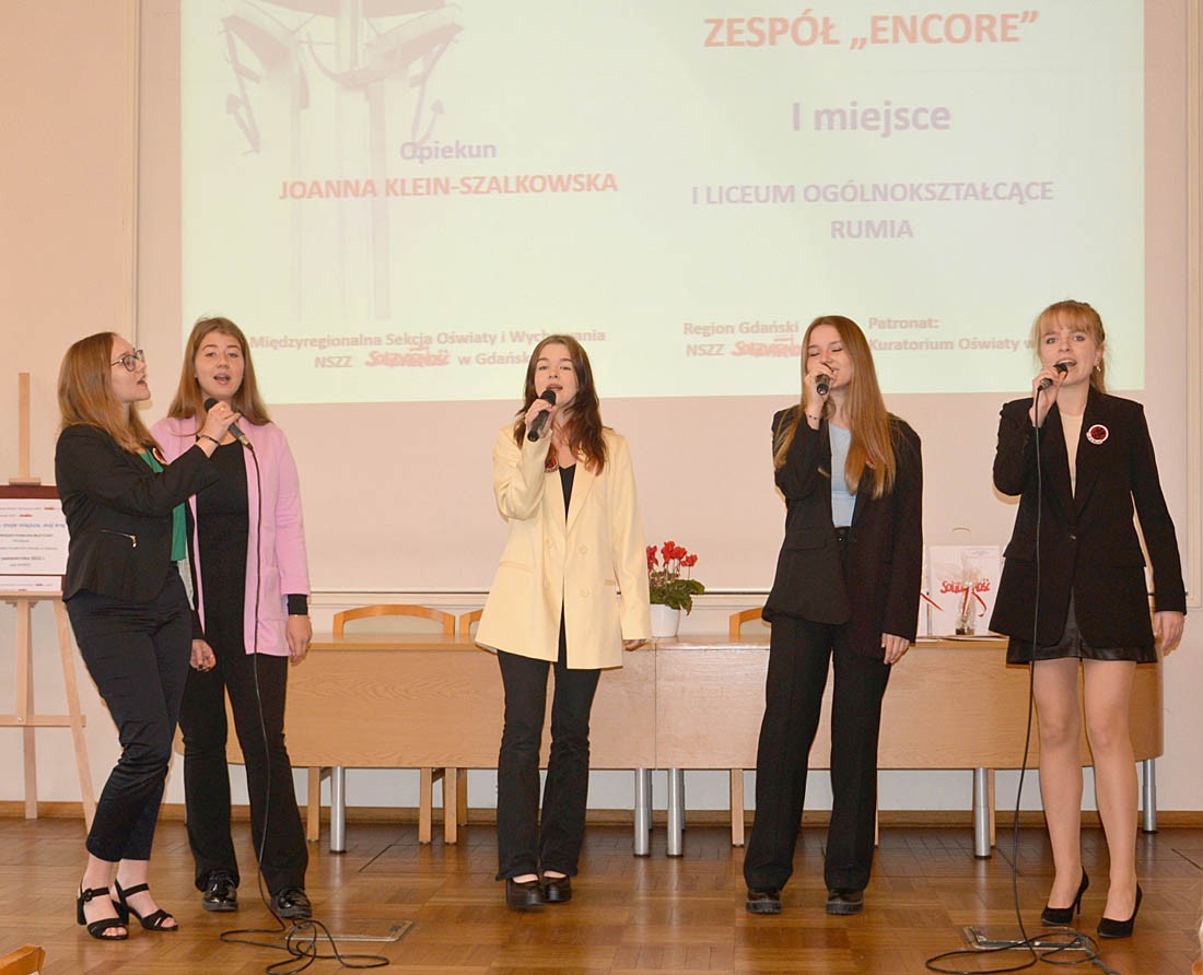 Na finałowe występy do Gdańska przyjechało ponad 300 uczniów szkół podstawowych i ponadpodstawowych. Najlepszy w swojej kategorii okazał się Zespół „ENCORE” z I Liceum Ogólnokształcącego w Rumii. Dziewczęta wykonały utwór Krystyny Prońko ,,Psalm stojących w kolejce”.
