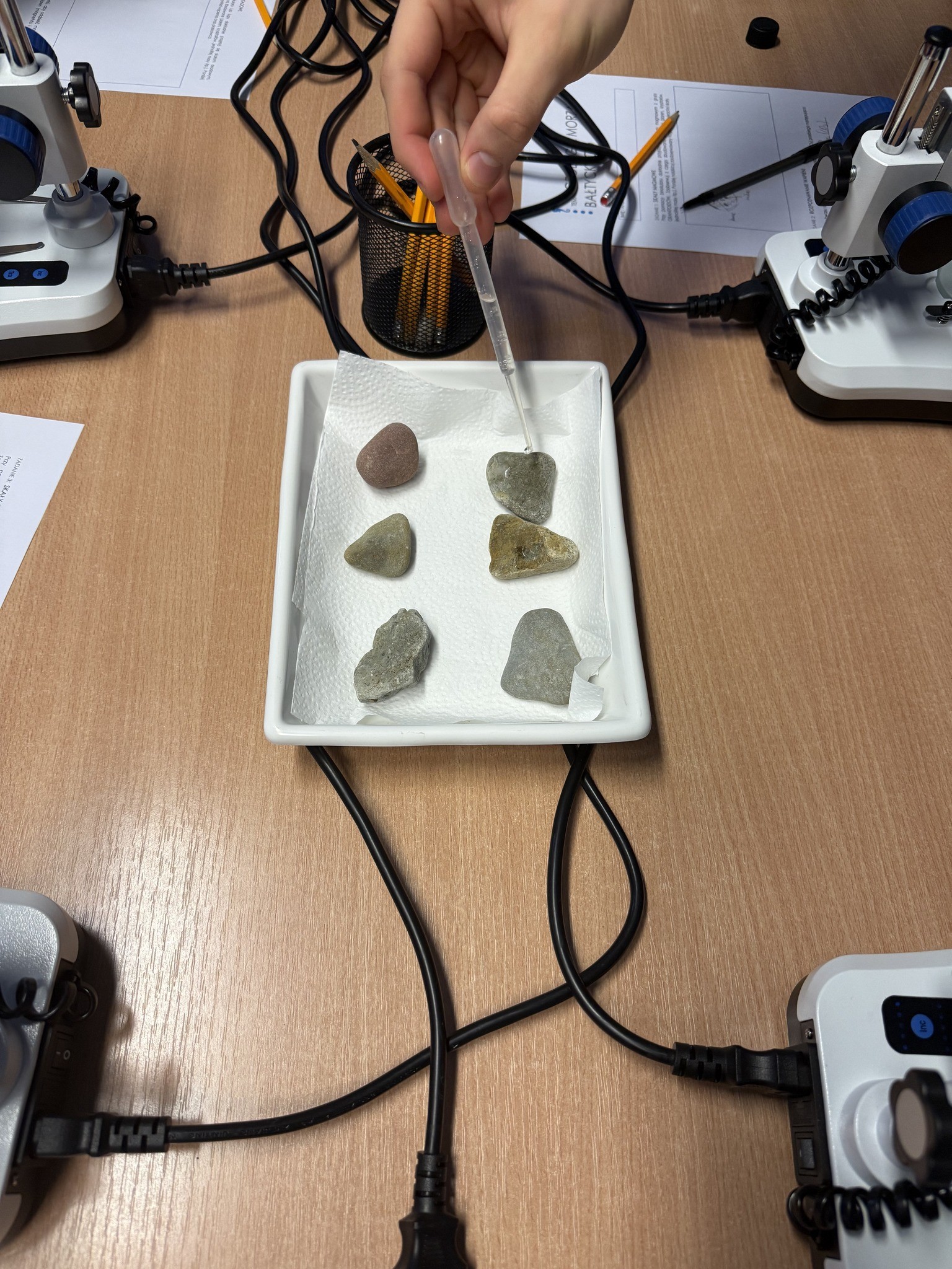 Na miejscu czekały na nas zajęcia dotyczące geologicznej przeszłości Morza Bałtyckiego. Uczniowie mogli wcielić się w rolę młodych geologów – rozpoznawali skały pod mikroskopami oraz obserwowali reakcje wybranych skał z kwasem solnym.