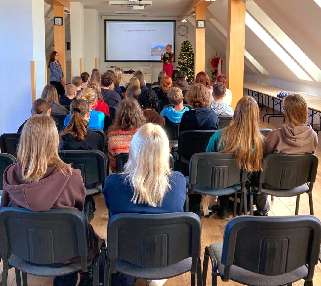 Podczas spotkania młodzież miała okazję zgłębić wiele interesujących faktów o Szwajcarii – kraju, który przyciąga nie tylko pięknymi krajobrazami, ale i wyjątkową kulturą. Warsztaty obfitowały w ciekawostki, z których niejedna była dla uczestników prawdziwym zaskoczeniem (np. fakt, że szwajcarskie prawo dopuszcza spożywanie mięsa z psów i kotów). Na zakończenie nie zabrakło również słodkiego akcentu – uczniowie zostali poczęstowani szwajcarskimi słodkościami, w tym słynną czekoladą Toblerone.