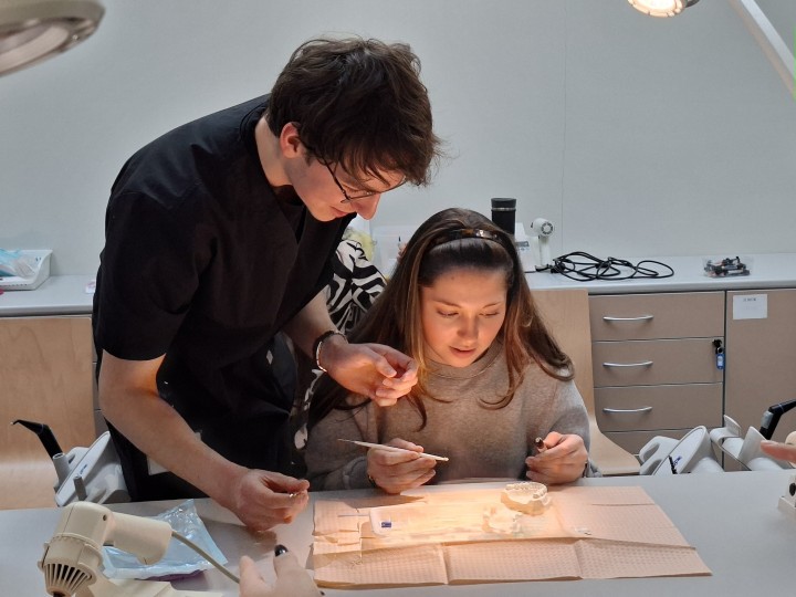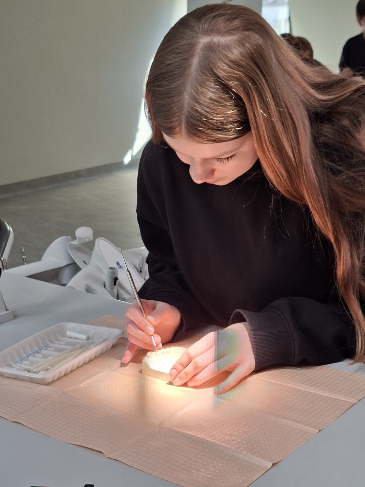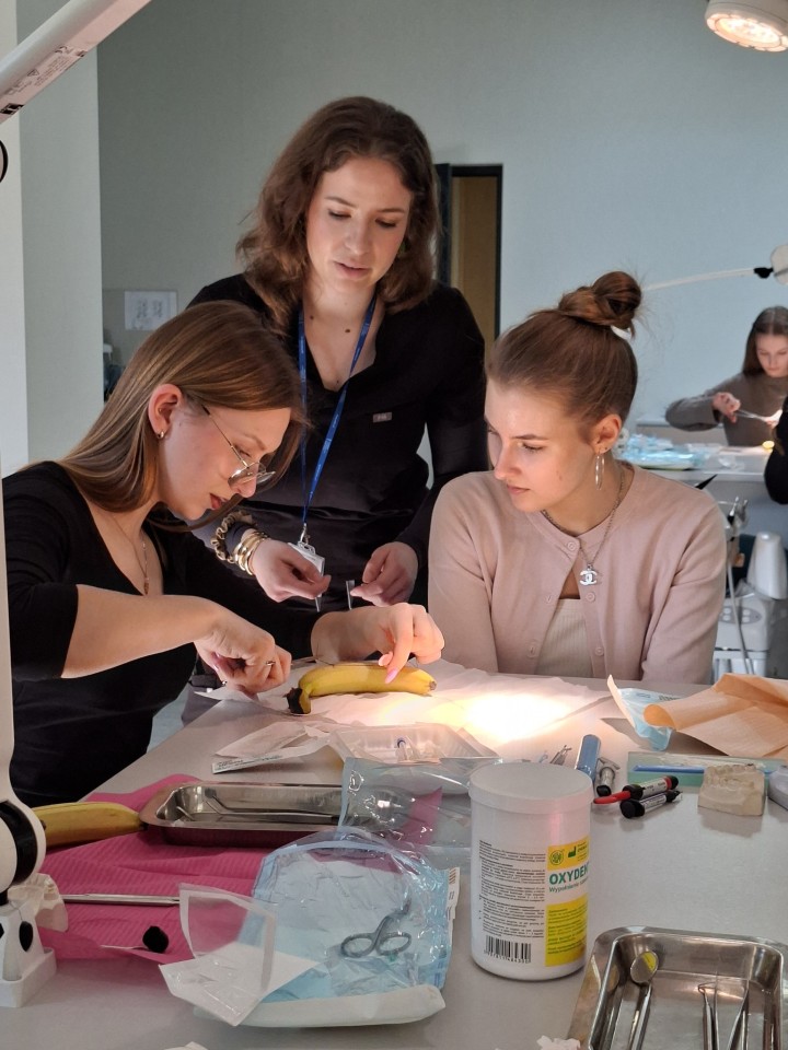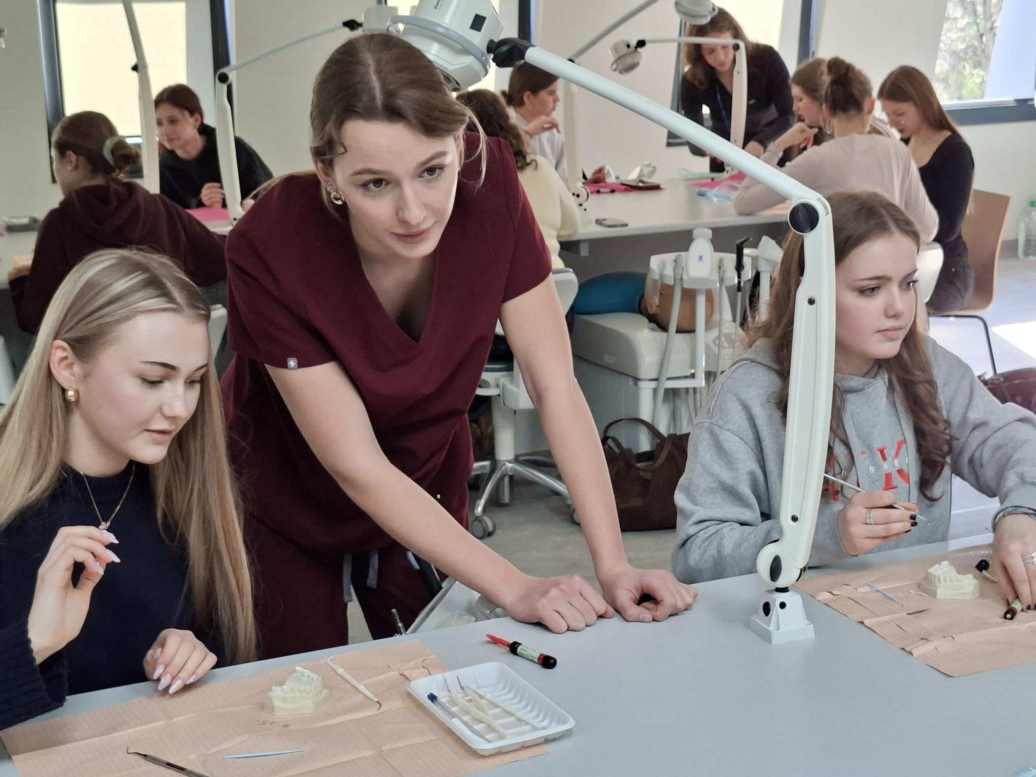 Zajęcia poprowadziły: pani dr n. med. Iwona Ordyniec Kwaśnica oraz pani lek. dent. Natalia Kempa. Podczas spotkania uczniowie poznali podstawy pracy stomatologa, a także mogli samodzielnie spróbować swoich sił w zadaniach praktycznych, takich jak wykonywanie szwów chirurgicznych czy tworzenie wypełnień stomatologicznych. W części warsztatowej aktywnie pomagali im również studenci stomatologii, wspierając uczestników w zdobywaniu pierwszych praktycznych umiejętności.