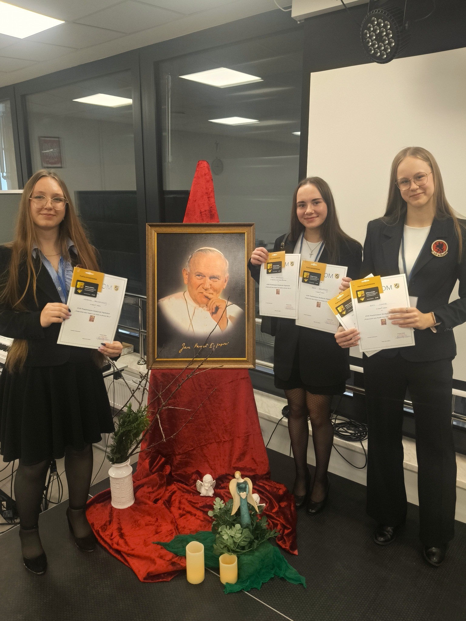 W piątek, 28 listopada uczennice naszej szkoły: Amelia Rzemińska, Agata Cichosz i Weronika Arciszewska z klasy 3a wzięły udział w XVIII Powiatowym Konkursie o Janie Pawle II. Amelia zajęła I miejsce indywidualnie w teście wiedzy o życiu i działalności papieża. I miejsce zdobyła również Agata w kategorii artystycznej, prezentacji miejsca związanego z wizytą papieża w czasie pielgrzymki do Polski. Cała drużyna, po części pisemnej i ustnej zajęła I miejsce.