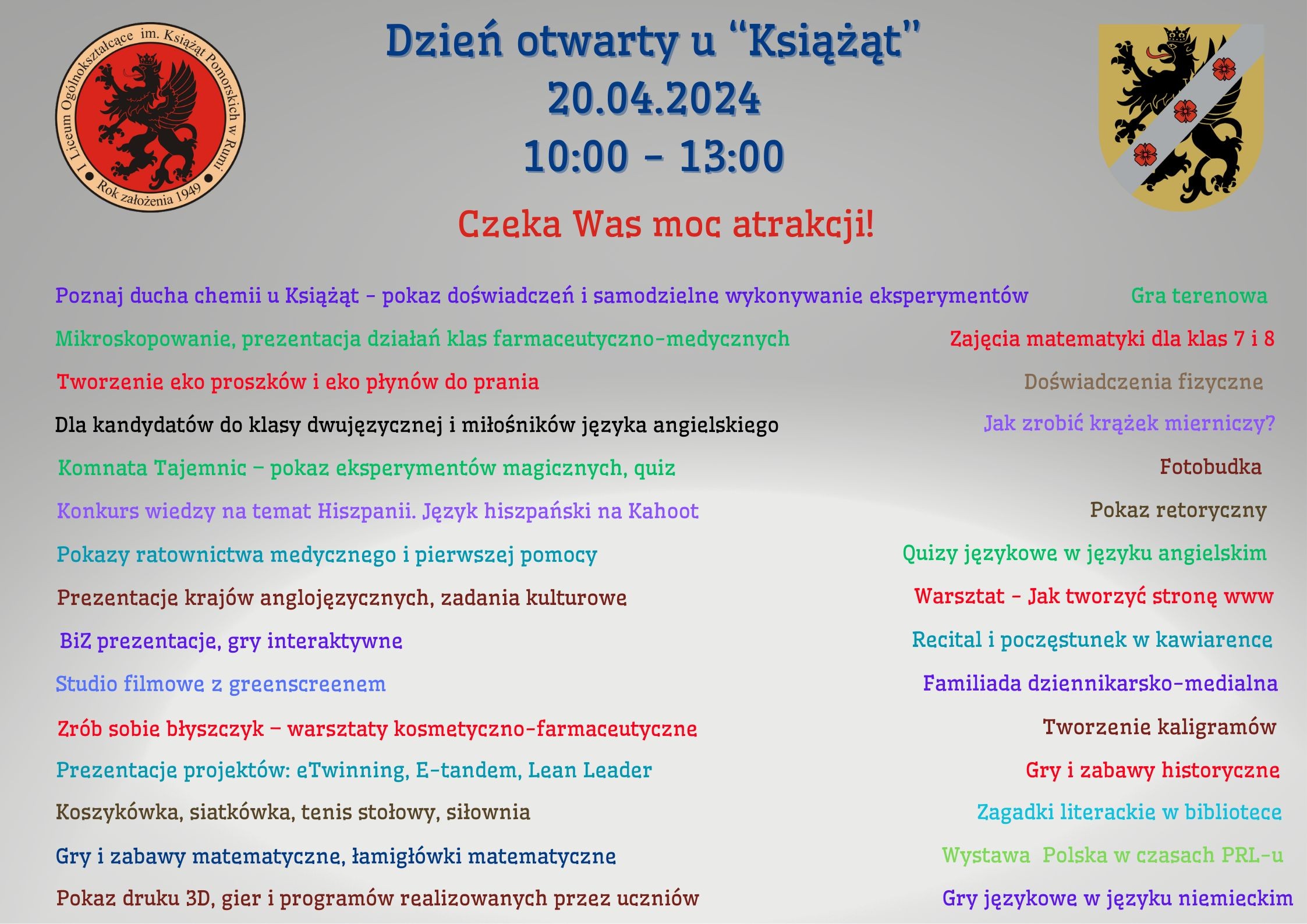 Na ten dzień nauczyciele i uczniowie przygotowali różne atrakcje dla odwiedzających nas gości. Można było wziąć udział m.in. w konkursach, pokazach ratownictwa medycznego, warsztatach kosmetycznych, w zajęciach z matematyk, doświadczeniach chemicznych i fizycznych, zwiedzić wystawę „Polska w czasach PRL-u” i Komnatę Tajemnic, w której zajęcia w Szkole Magii prowadziła pani McGonagall. Chętni mogli porozmawiać w CRO z doradcą zawodwym o dalszej edukacji po ukończeniu danego profilu. Dla miłośników języków obcych przygotowano prezentacje o krajach anglojęzycznych a także konkurs wiedzy na temat Hiszpanii oraz gry językowe w języku niemieckim. Na odwiedzających czekały zmagania sportowe, zagadki literackie, gry interaktywne, familiada dziennikarsko-medialna i wiele innych akacji.